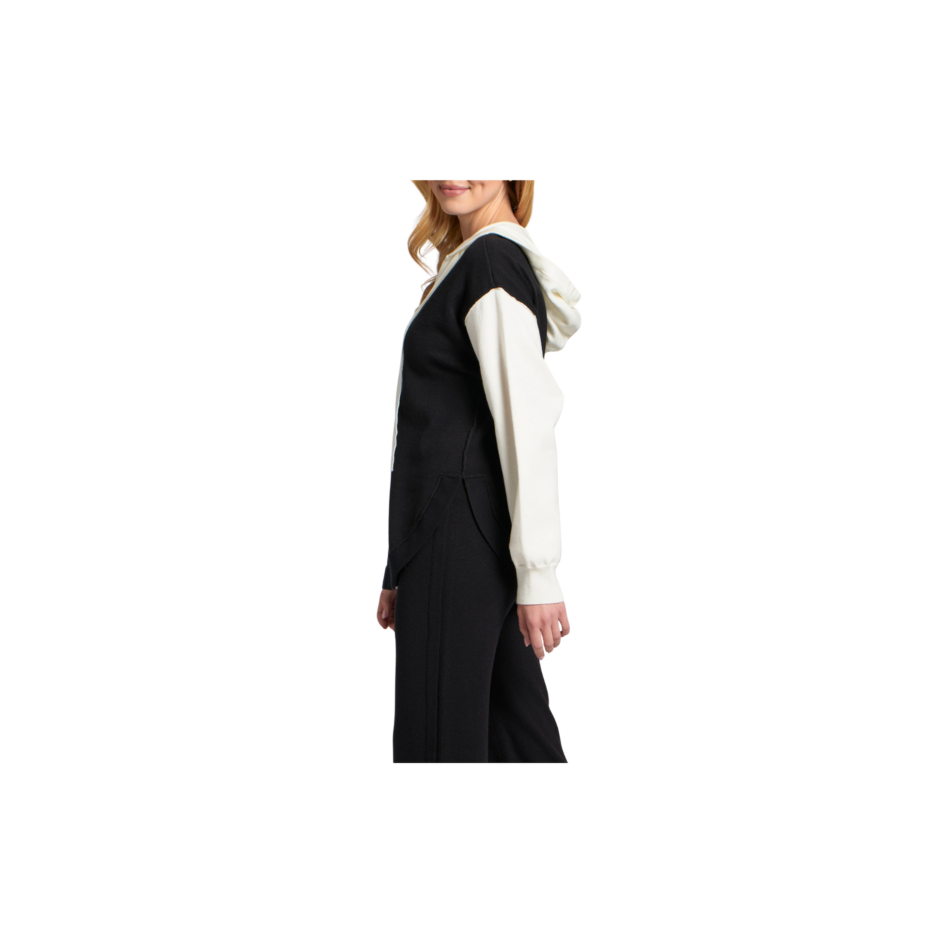 This is a women’s colorable hoodie-style knit top featuring a relaxed, sporty design. Designed in black and ivory for a bold contrast look, this hoodie top offers comfortable layering for casual outings, travel, or athleisure-inspired styling.