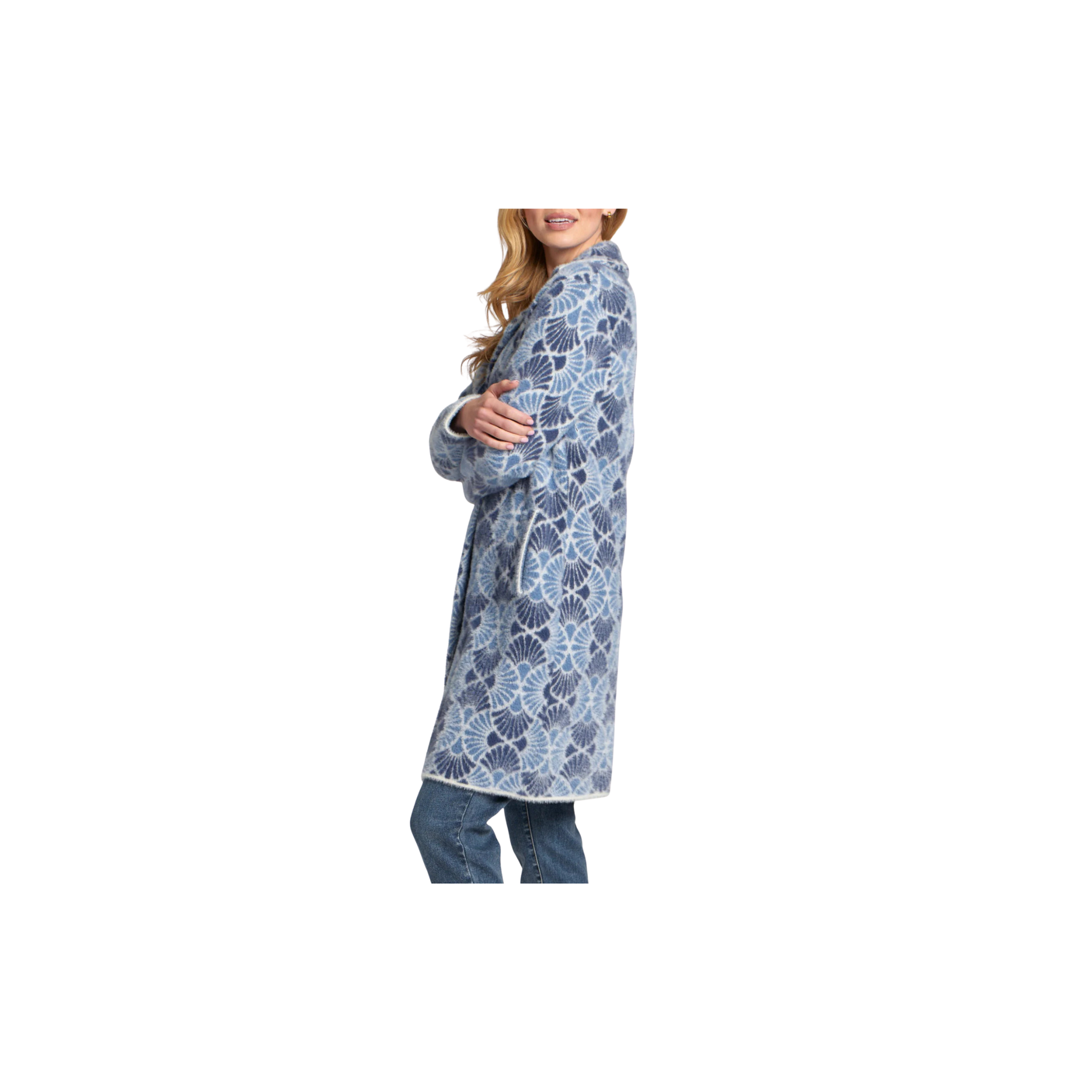 Elevate your outerwear collection with this elegant longline wool-blend coat, crafted for both warmth and standout style. The coat features a luxuriously soft, textured jacquard fabric in a stunning shell-inspired pattern of light and dark blues, offering a sophisticated and artistic flair.