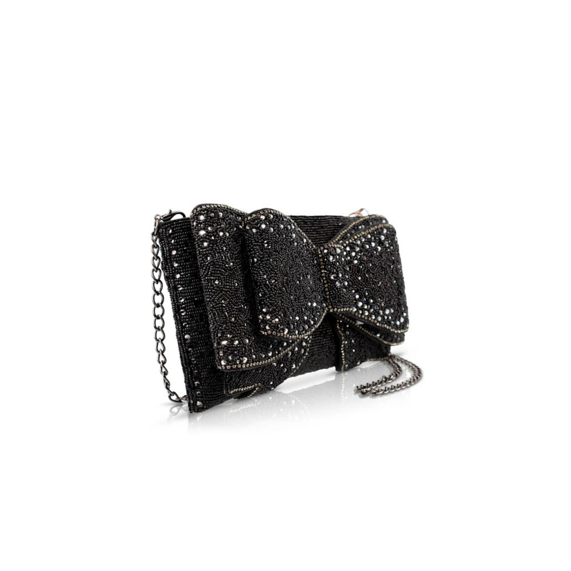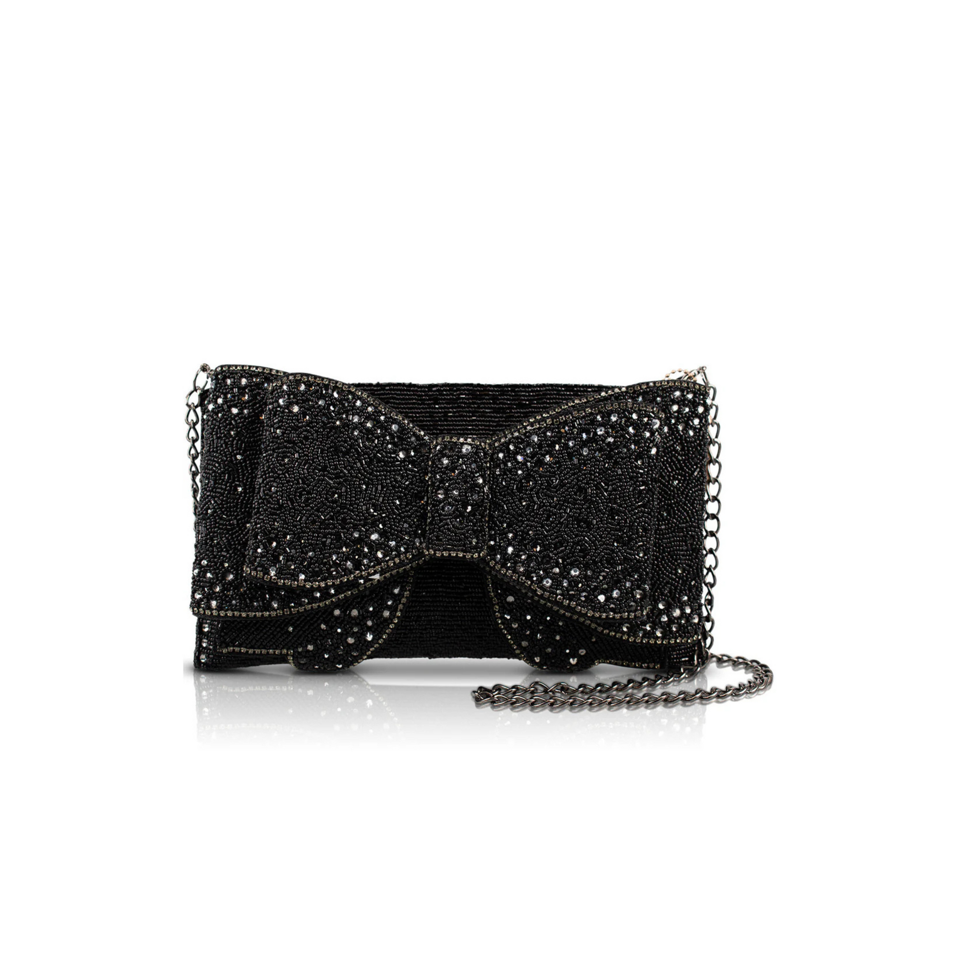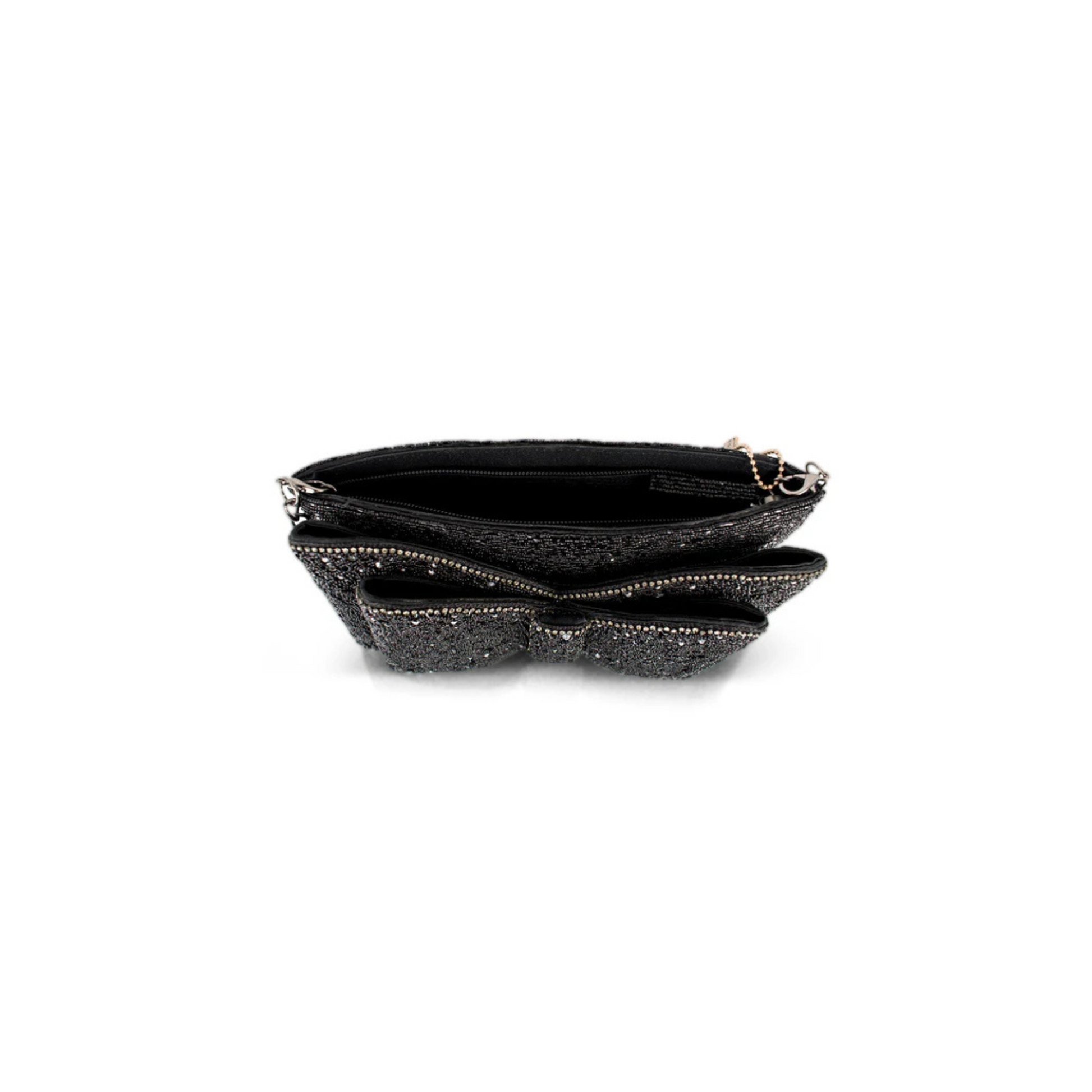 Cute meets cool in this glitzy showstopper! With its oversized sparkly bow and sleek silhouette, this purse brings serious main-character energy. Whether you're dressing up denim or dazzling in heels, it's the cherry on top of any outfit. Wear it as a clutch by sliding your hand beneath the bow or go hands-free with the shoulder strap.