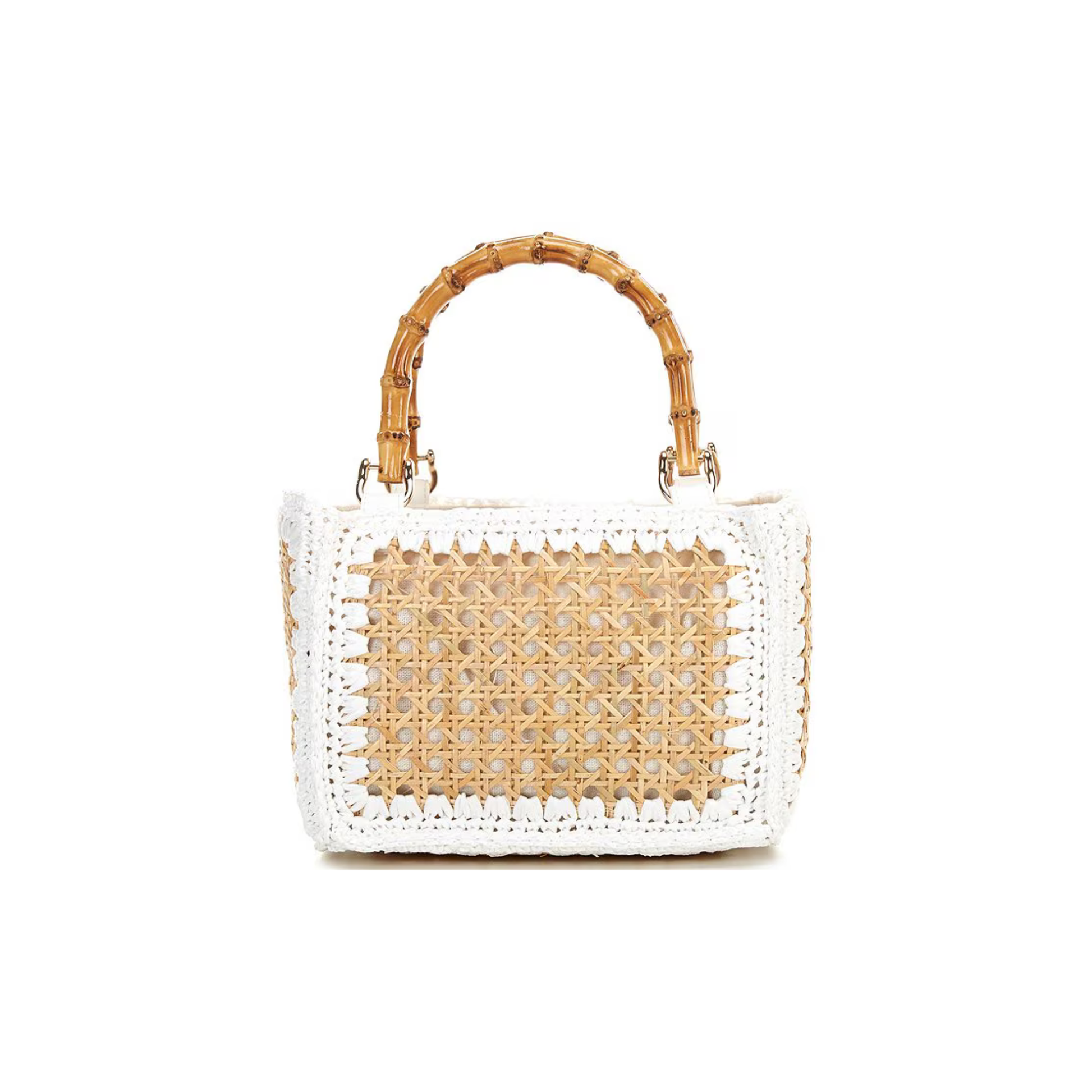 The Elodie Top Handle Bag brings a refined, coastal feel to everyday dressing. Crafted with cane-inspired weaving and finished with a smooth bamboo handle, it adds warmth and texture to any warm-weather look. Structured, lightweight, and easy to carry, it is an effortless choice for sunny outings, vacation plans, and casual evenings.