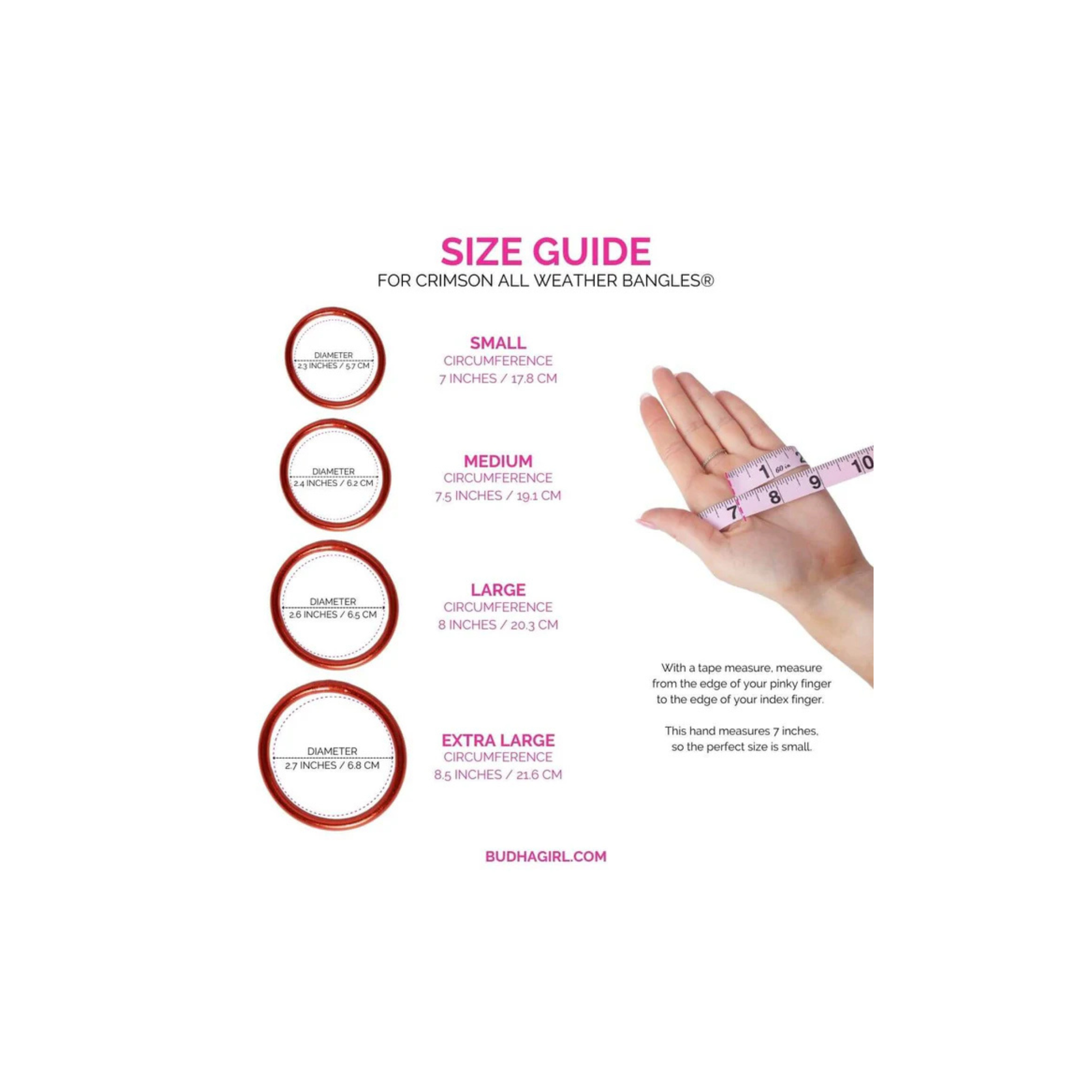 BuDhaGirl Crimson All Weather Bangles® (AWB®) are available for a limited time only! Crimson All Weather Bangles® (AWB®) are the epitome of luxury in BuDhaGirl's impressive lifestyle collection. Our remarkable bangles redefine elegance with their weightless, soundless, waterproof, and TSA-proof design. Crafted to perfection, each set comprises of three bangles, symbolizing intentions for the day. Wear them anywhere, as their soundless and waterproof nature ensures seamless integration into any setting.