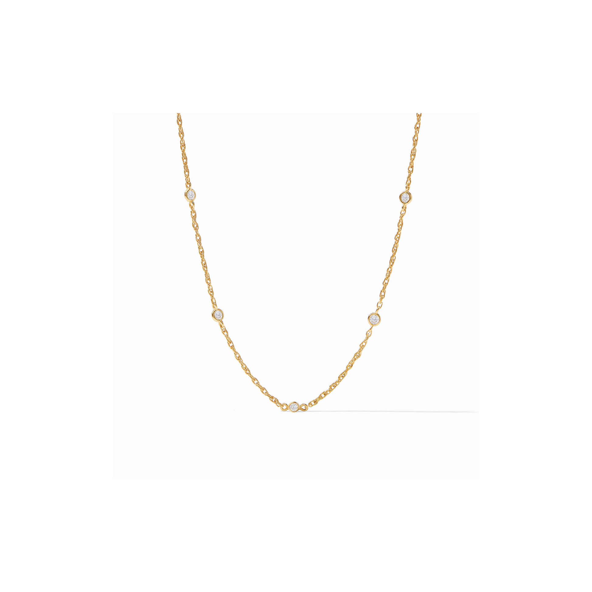 Add an understated touch of elegance to your special occasion wardrobe with the barely-there sparkle and shine of this golden, cubic zirconia-accented necklace.
