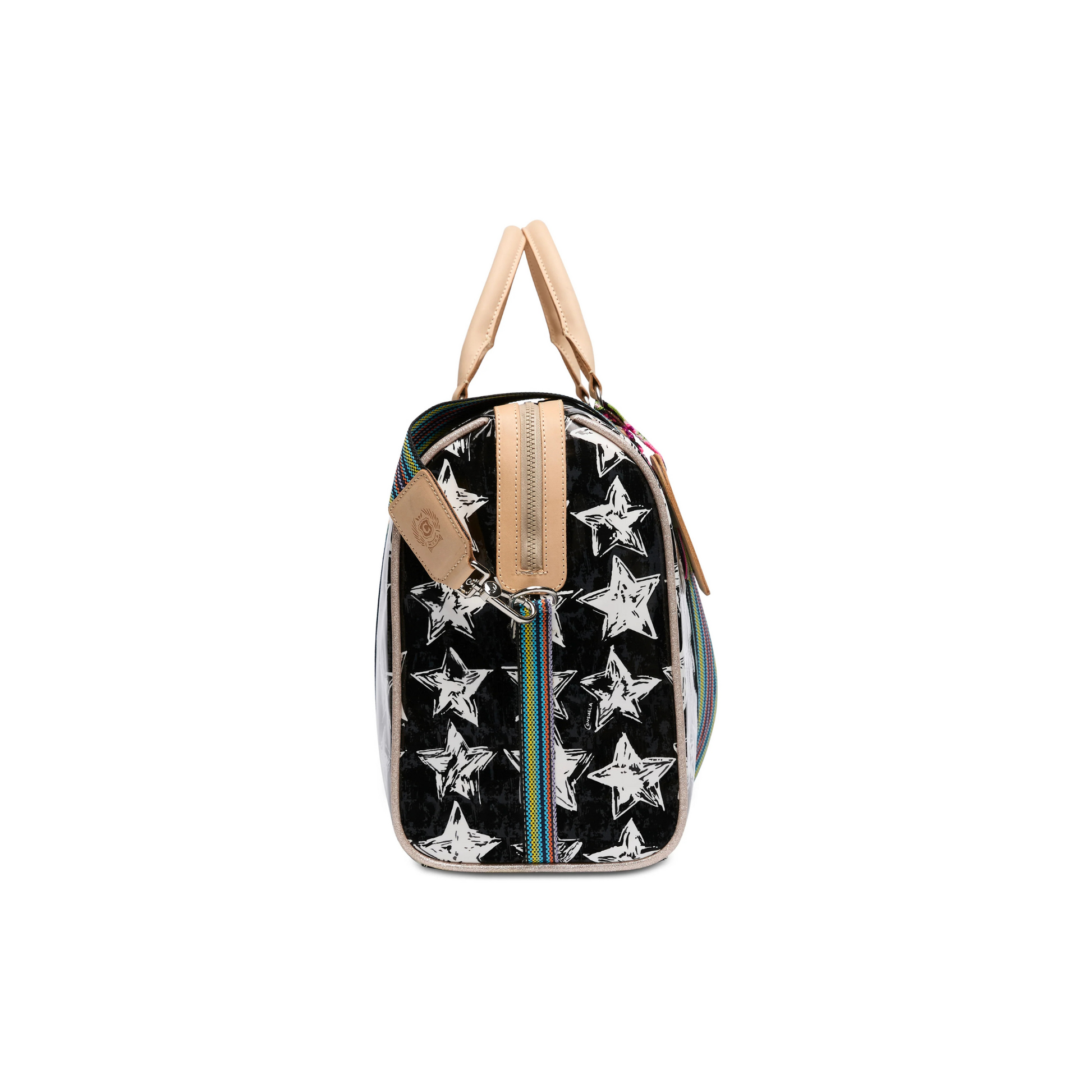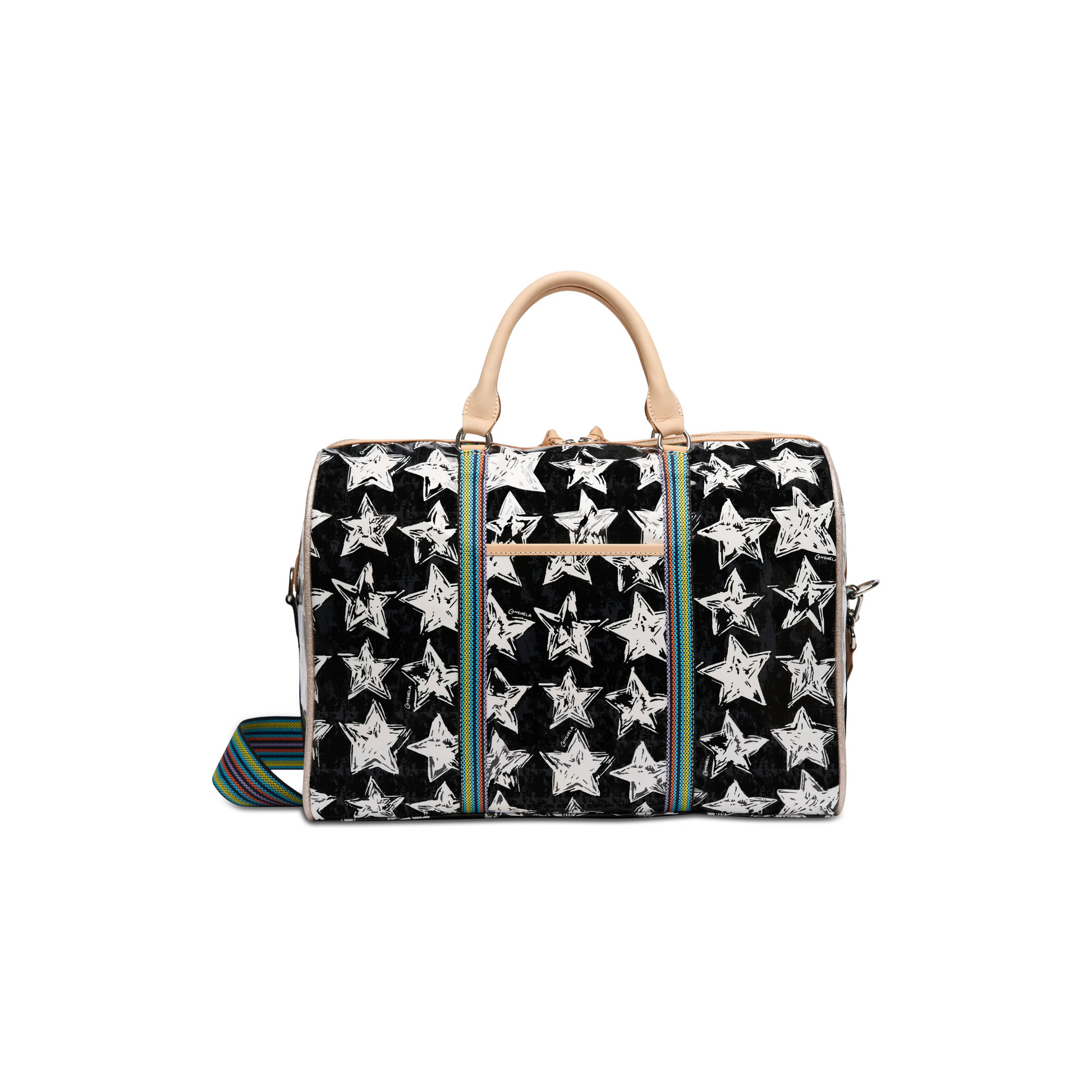 - Natural leather handles and multicolored, woven, adjustable crossbody shoulder strap