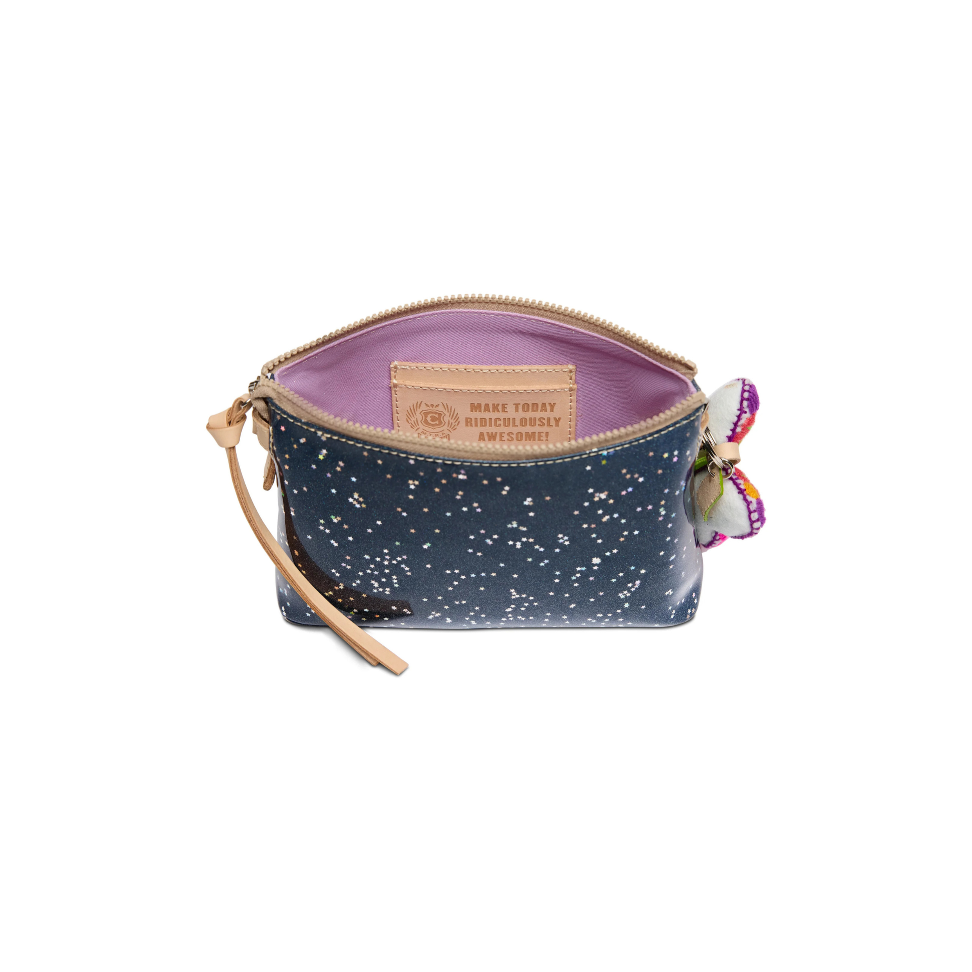 - Includes detachable and adjustable woven crossbody strap