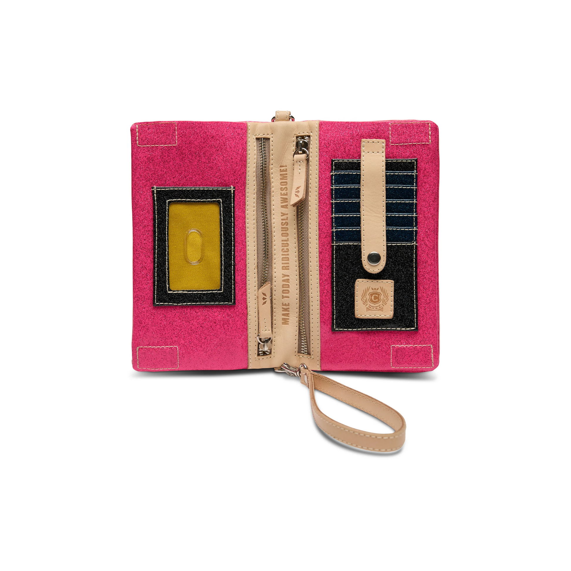- Included detachable wristlet strap and adjustable woven crossbody strap