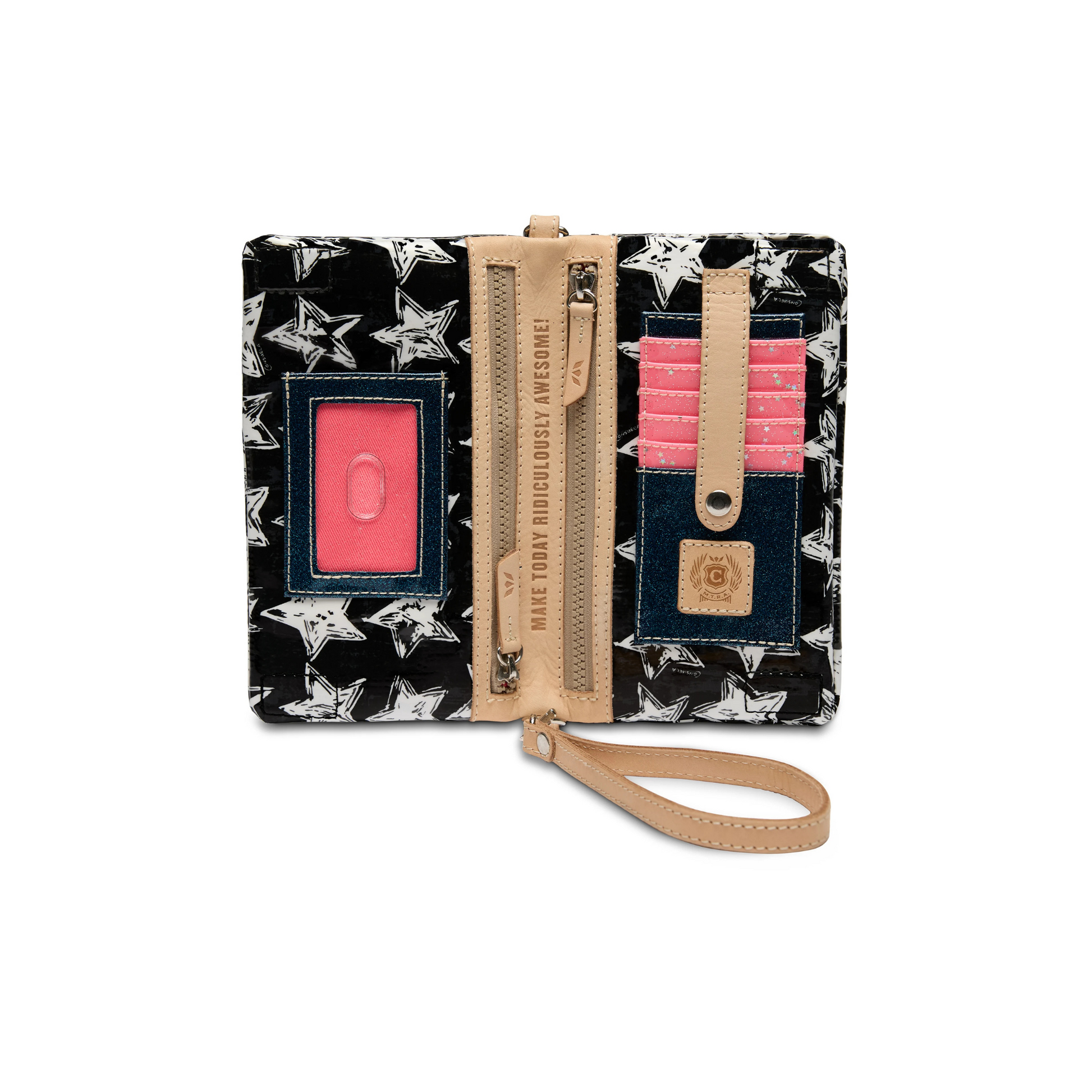 - Included detachable wristlet strap and adjustable woven crossbody strap