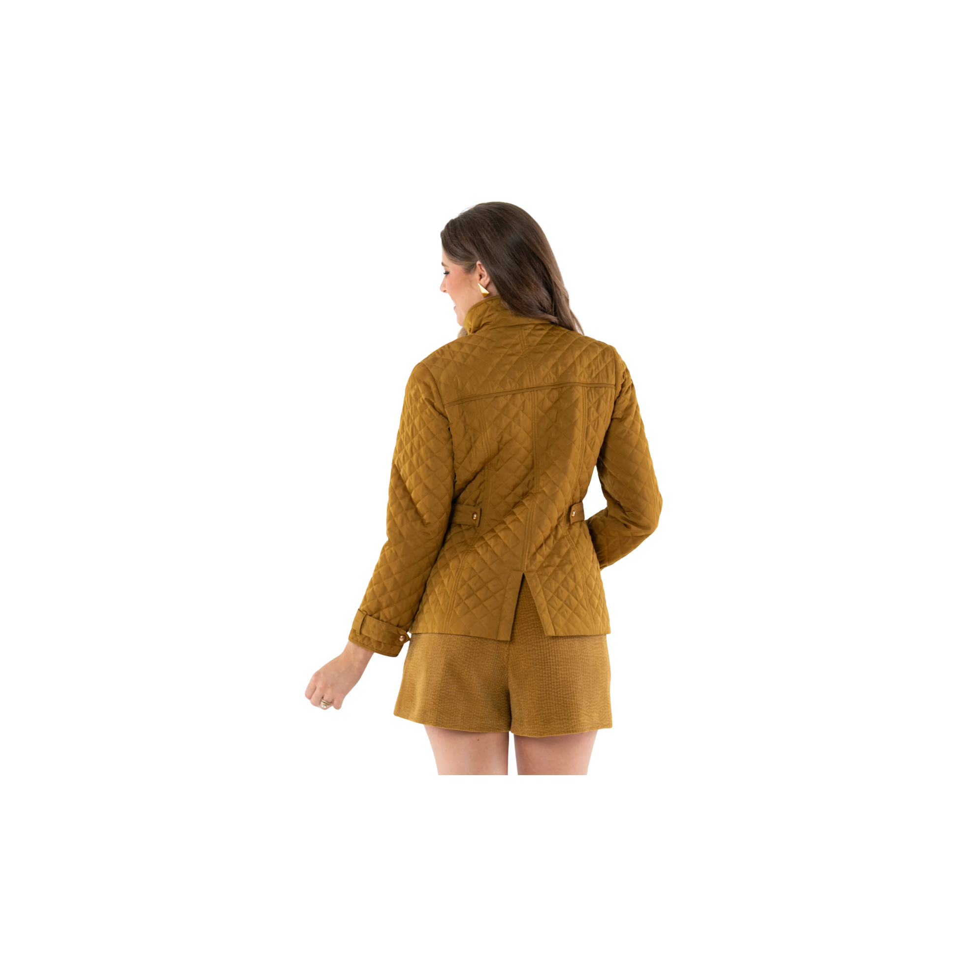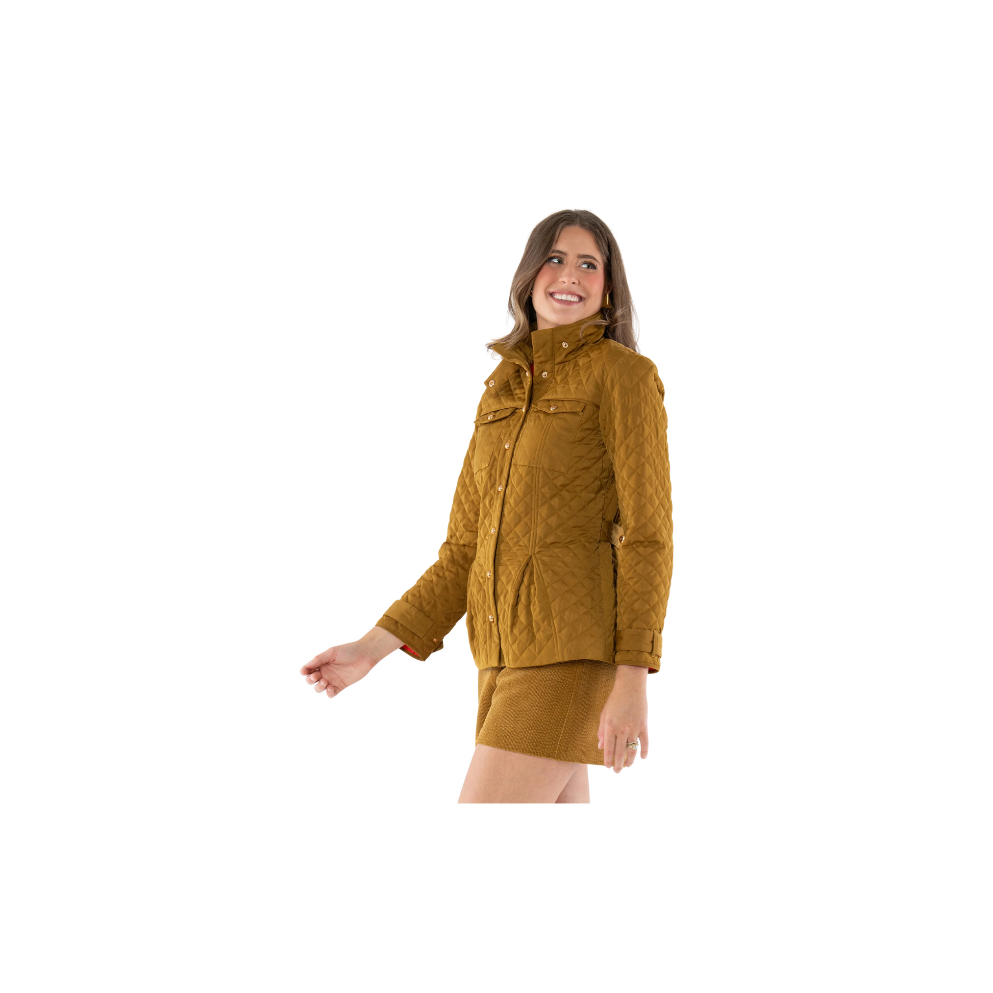 The Barn Jacket in Tapenade is a timeless layering piece designed with a tailored yet functional silhouette. Crafted in a soft quilted fabric with a diamond stitch pattern, it balances warmth with structure. The style features a stand collar with snap closure, gold snap hardware along the front placket, and double chest pockets for utility-inspired detailing. Subtle pleats at the waist create a flattering shape while maintaining comfort and ease of movement. Finished with a pop of contrast from the bold red lining, this jacket brings refined versatility to cooler days.
