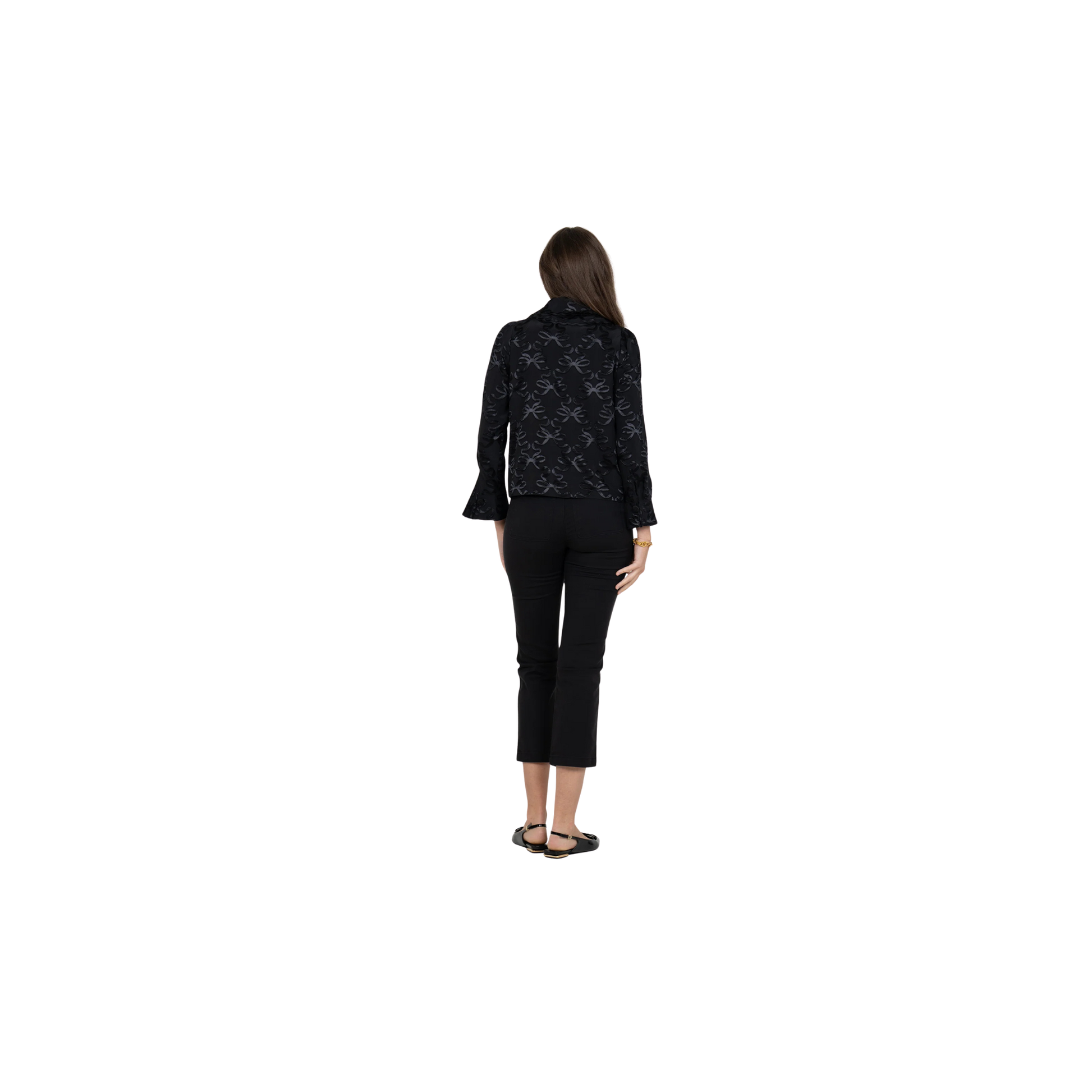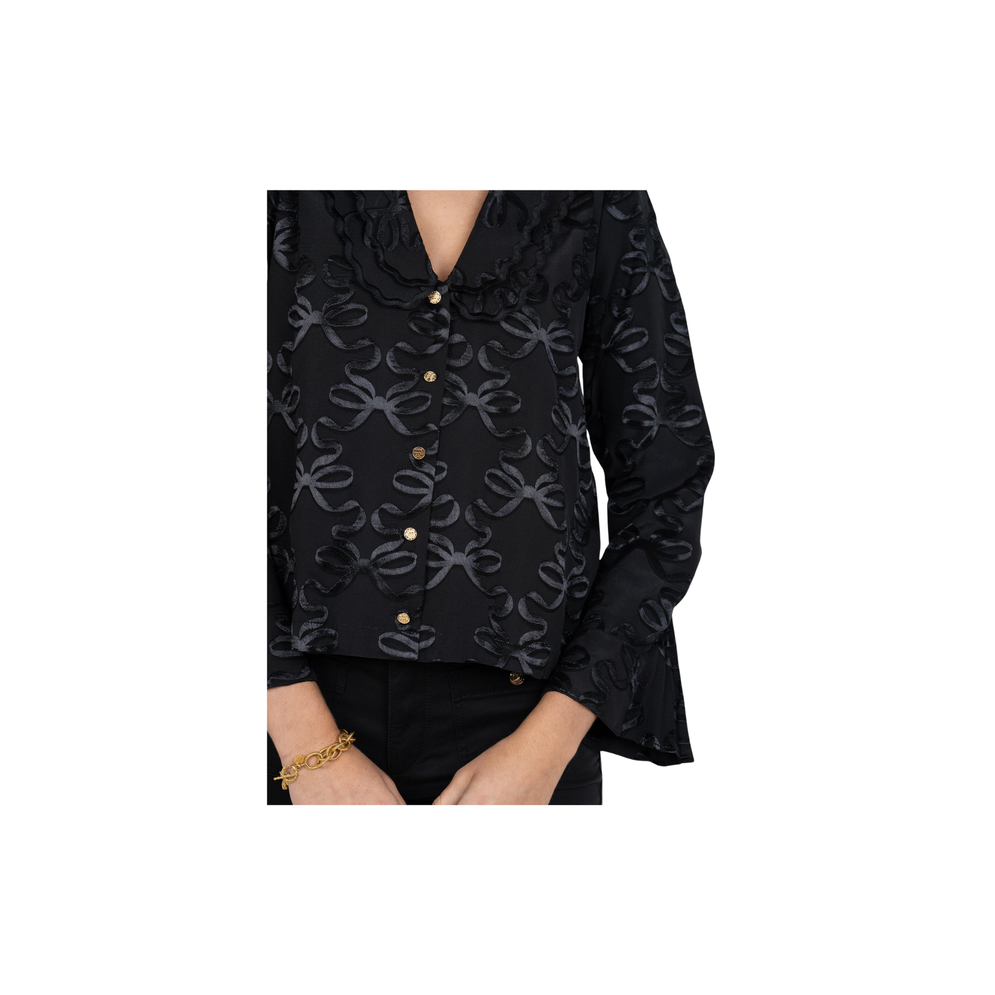 The Cameron Top in Bow Lattice features a scalloped collar, signature gold button front, pleated cuff sleeves, and a relaxed silhouette. Crafted in a tonal jacquard silk blend, the velvety bow motif adds rich texture and dimension. Lightweight with subtle sheen, this fabric highlights the lattice design while keeping the shape soft and wearable.