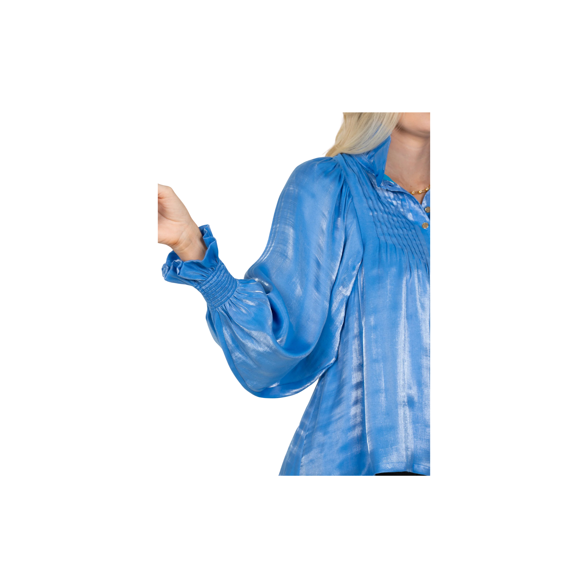 The Charlotte Top in Sapphire features a ruffled stand collar, pin tuck pleats along the front, smocked sleeves with ruffle cuffs, and a partial button front closure. Crafted in a silk blend, the fabrication is woven with shimmering threads that reflect light beautifully, adding subtle dimension to its fluid silhouette.
