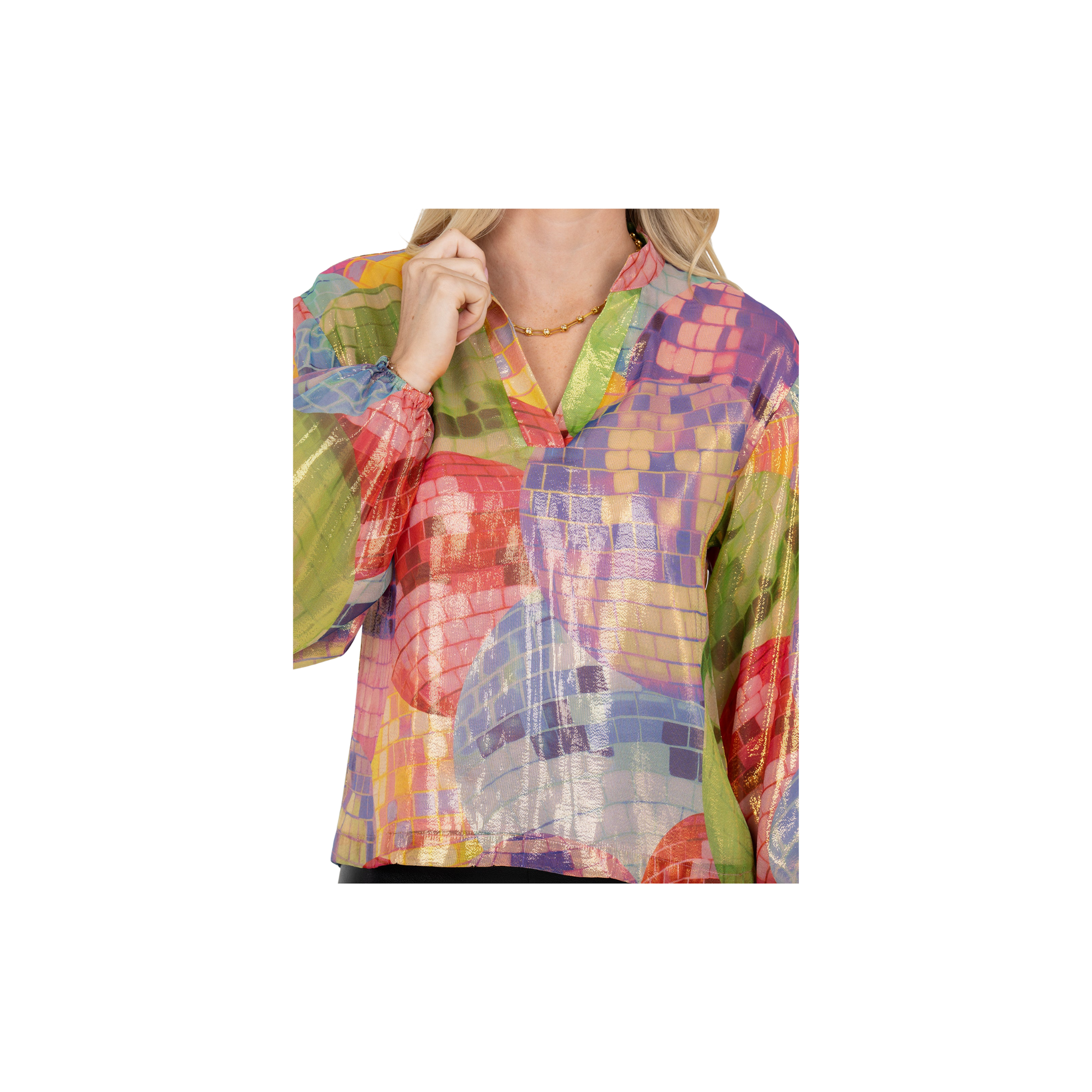 The Lolli Top in Disco features a notched neckline, relaxed blouson sleeves with gathered cuffs, and a loose, easy silhouette. Metallic threads are woven through rich silk, creating a luminous, reflective finish that catches the light with every movement. The iridescent surface evokes the brilliance of a spinning disco ball, making this top a true statement piece designed to shine.