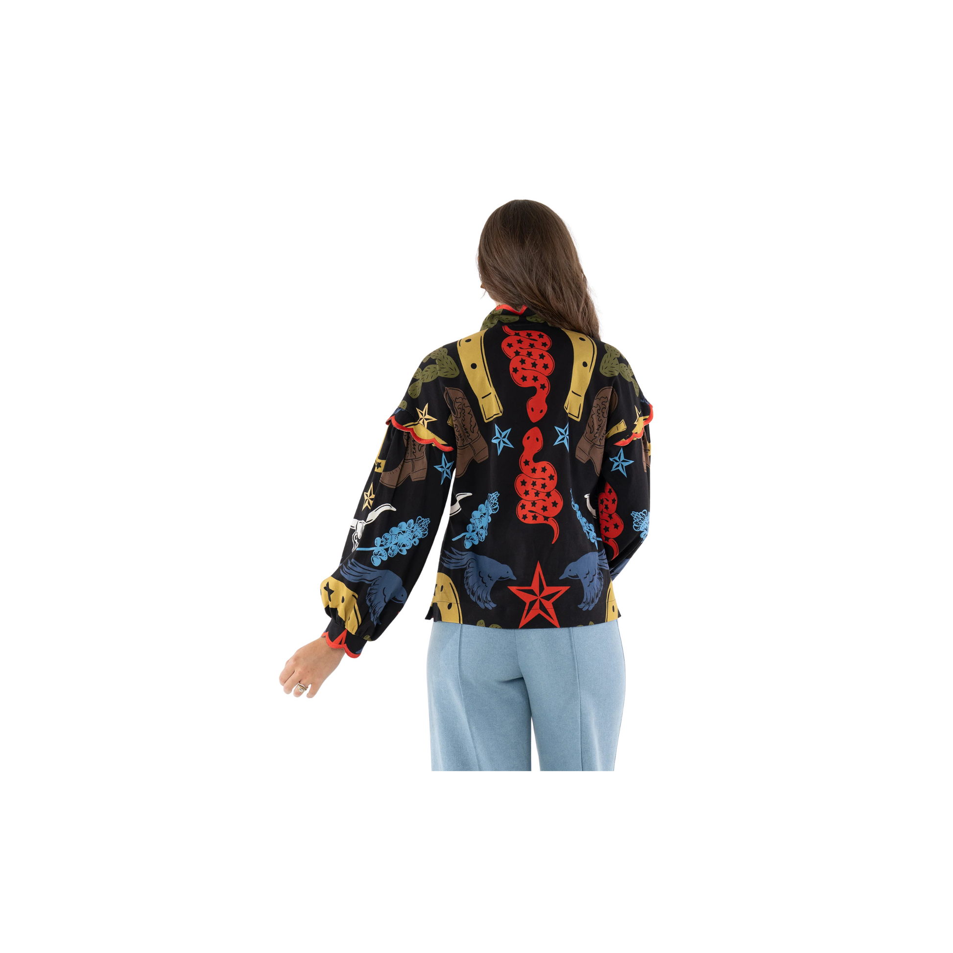 The Orchid Top celebrates the spirit of this collection with a bold display of western heritage. The Lone Star print showcases iconic Texas symbols—boots, stars, snakes, and more—woven into a storytelling pattern that honors the state’s legacy. Scalloped trim highlights the neckline, shoulders, and sleeve hems, adding a touch of femininity to the strong design. Finished with a slightly tailored silhouette, these top balances playful novelty with elevated style, making it a true statement piece.