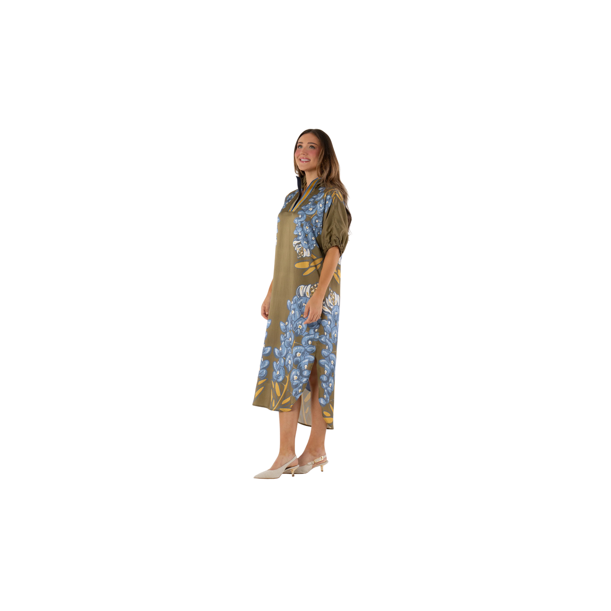 The Poppy Caftan in Bluebonnet is a relaxed yet elevated silhouette that captures the essence of western charm through the Texas state flower. Designed with loose elastic dolman sleeves and a classic stand collar, it drapes effortlessly in a loose-fitting shape that flatters while offering all-day comfort. The curved shirttail hem and side slits add fluidity and ease of movement, while the placed print creates a striking vertical effect that elongates the figure. A versatile piece, the Poppy Caftan transitions seamlessly from day to evening with its effortless sophistication.