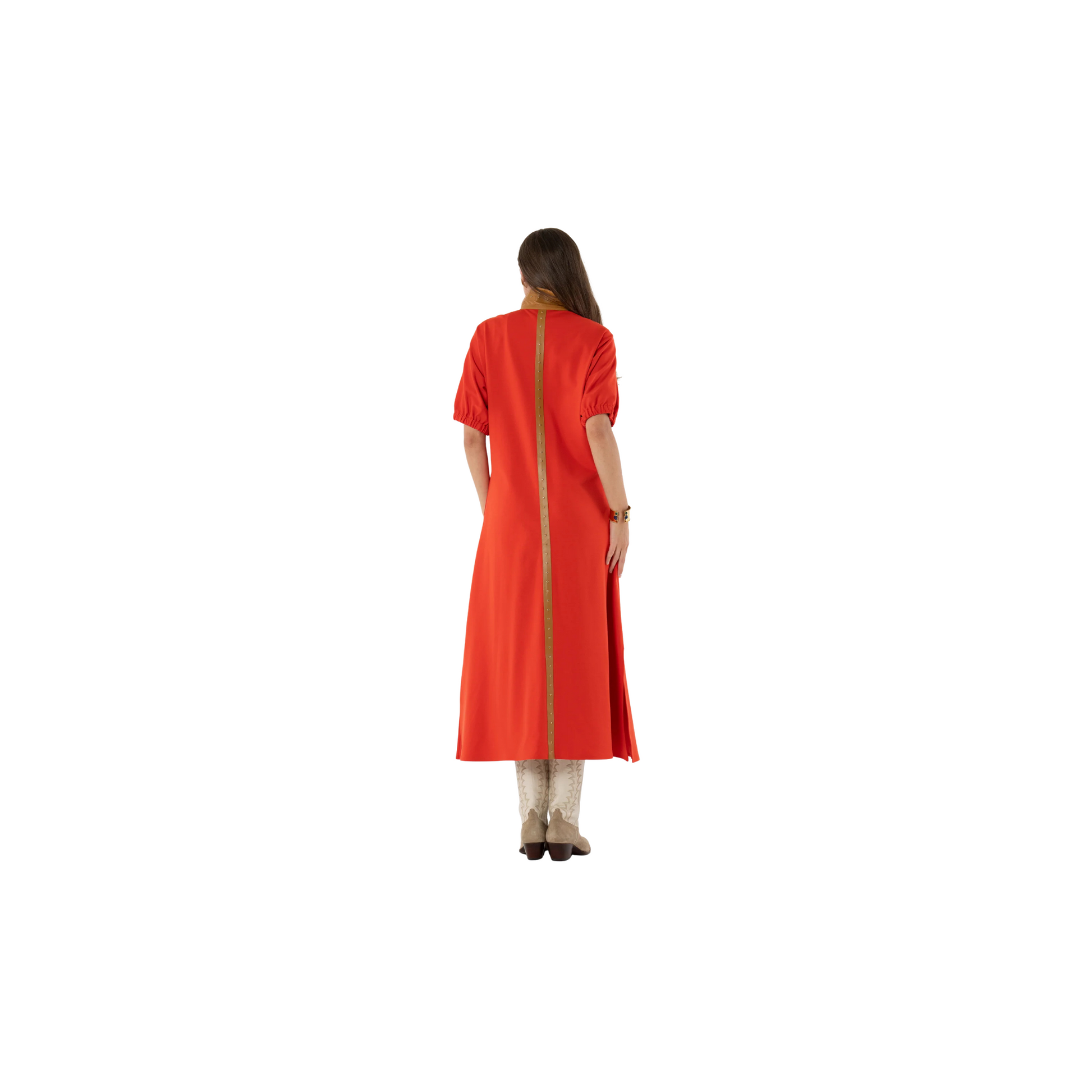 The Poppy Maxi in Valiant Poppy is a striking solid ponte style elevated with bold detailing. Designed with a classic stand collar and relaxed dolman sleeves, these maxi features vegan leather trim running down the center front and back, accented with gleaming gold studs for a touch of western-inspired edge. The relaxed silhouette flows into a maxi-length hem with side slits, offering both ease and movement. Sophisticated yet statement-making, this piece brings modern structure to a timeless shape.