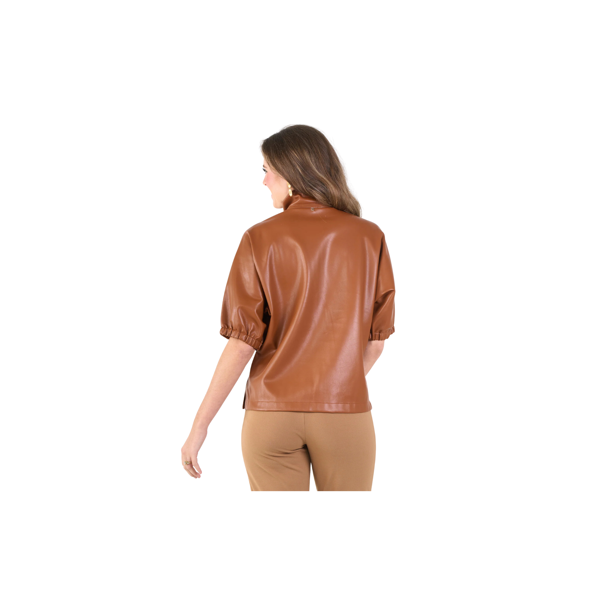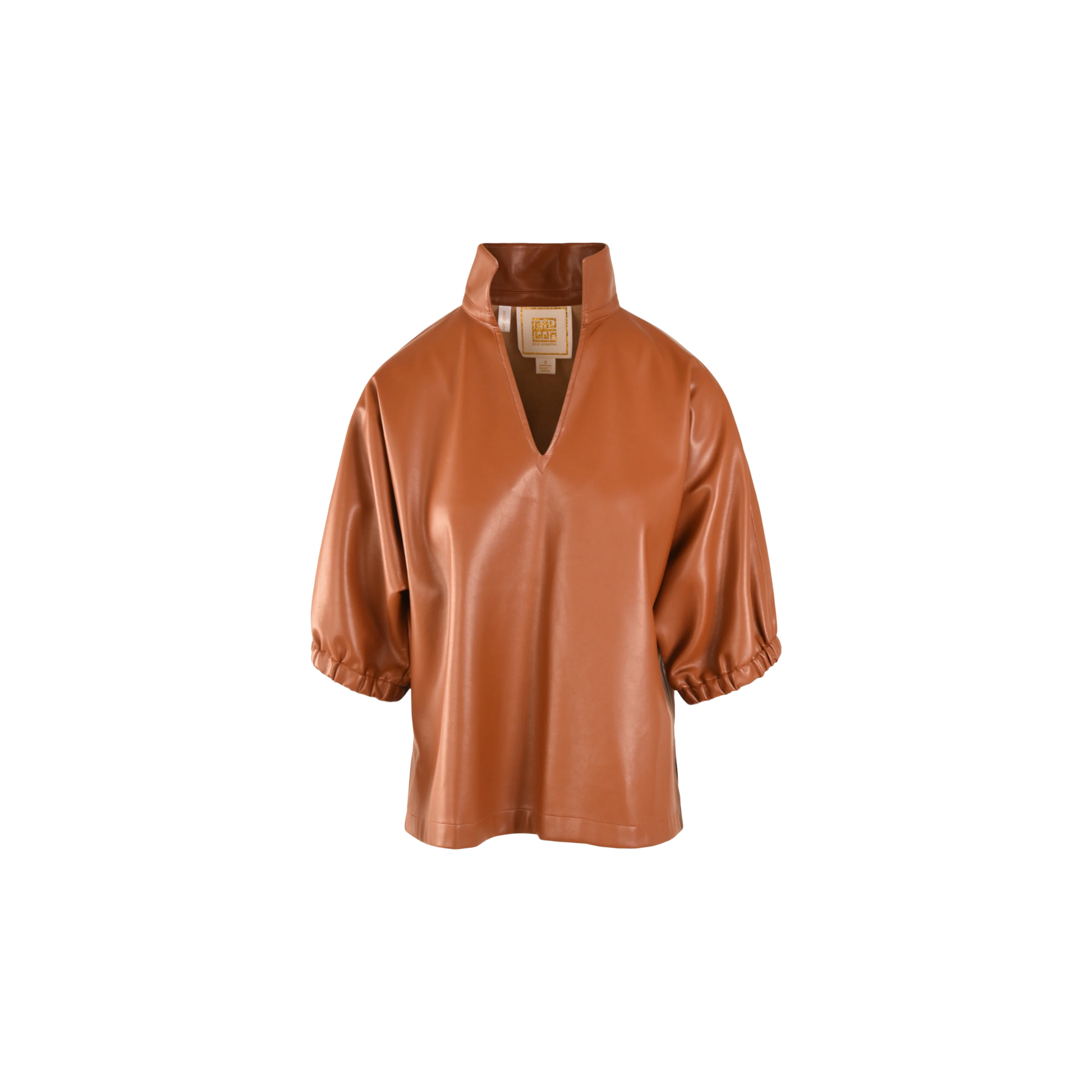 The signature Poppy Top in Luggage Vegan Leather. A classic statement piece for any occasion. Pair with denim & statement jewelry, from the office to drinks with friends. Loose-fitting with an optional stand-up collar.