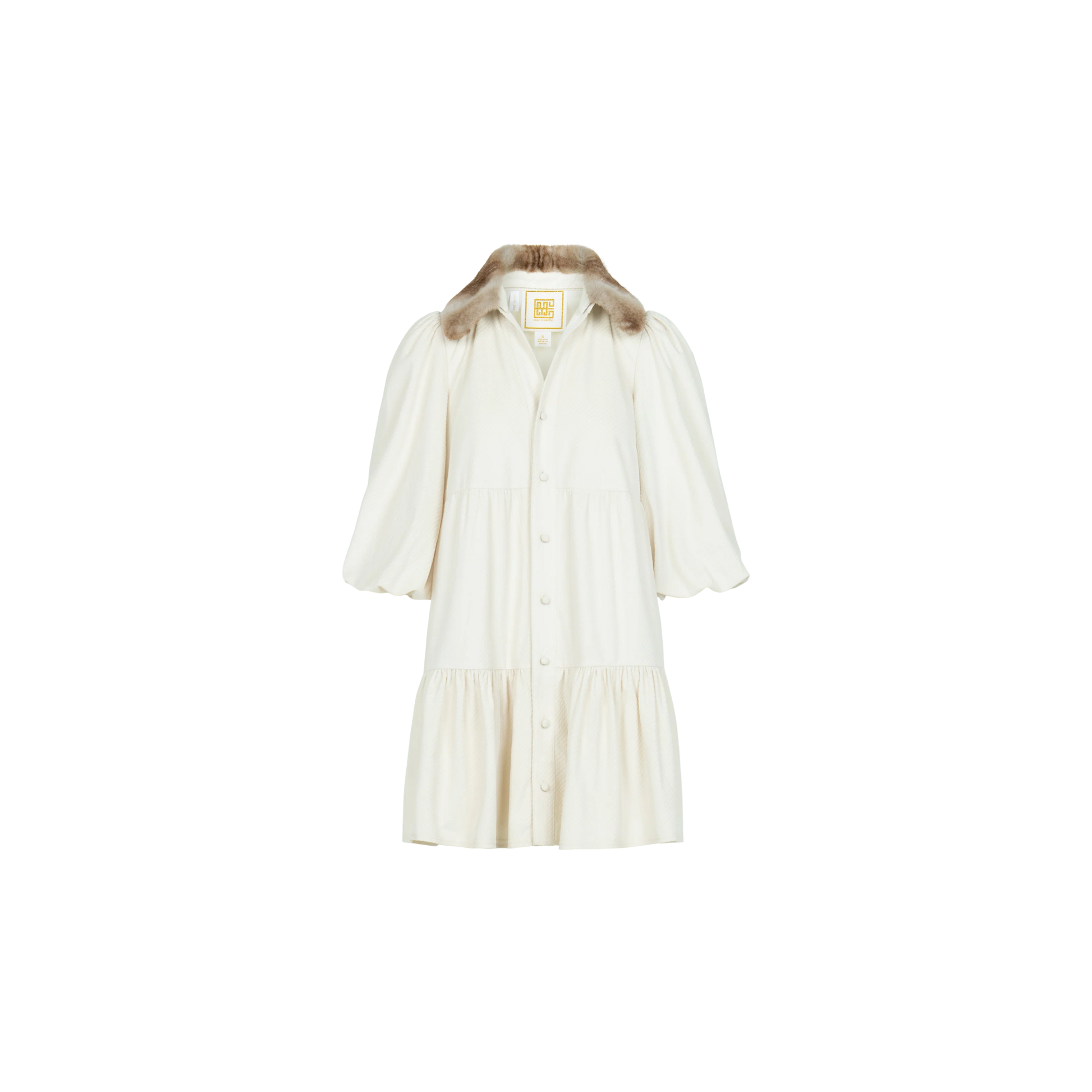 The Sadie Dress in Winter White features a detachable fur collar, covered button closures, blouson sleeves, and a tiered, loose-fitting silhouette. Crafted in a lightweight textured velvet, this dress balances warmth with ease, offering comfort and versatility for the season.