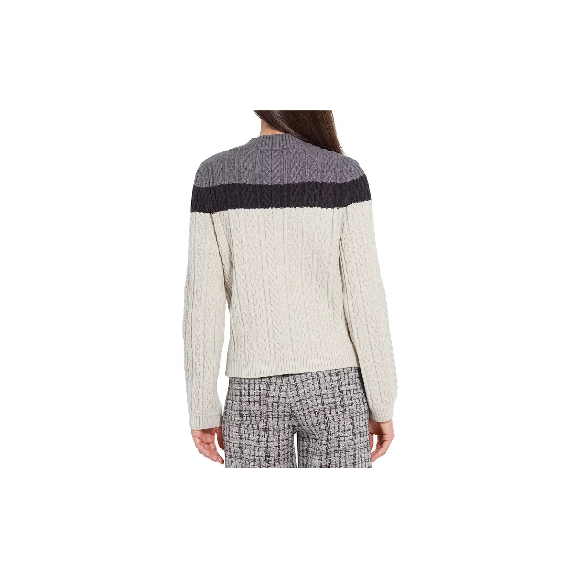 A cozy cable-stitch design and sporty color blocking converge on this crewneck sweater imagined in a slightly cropped length.