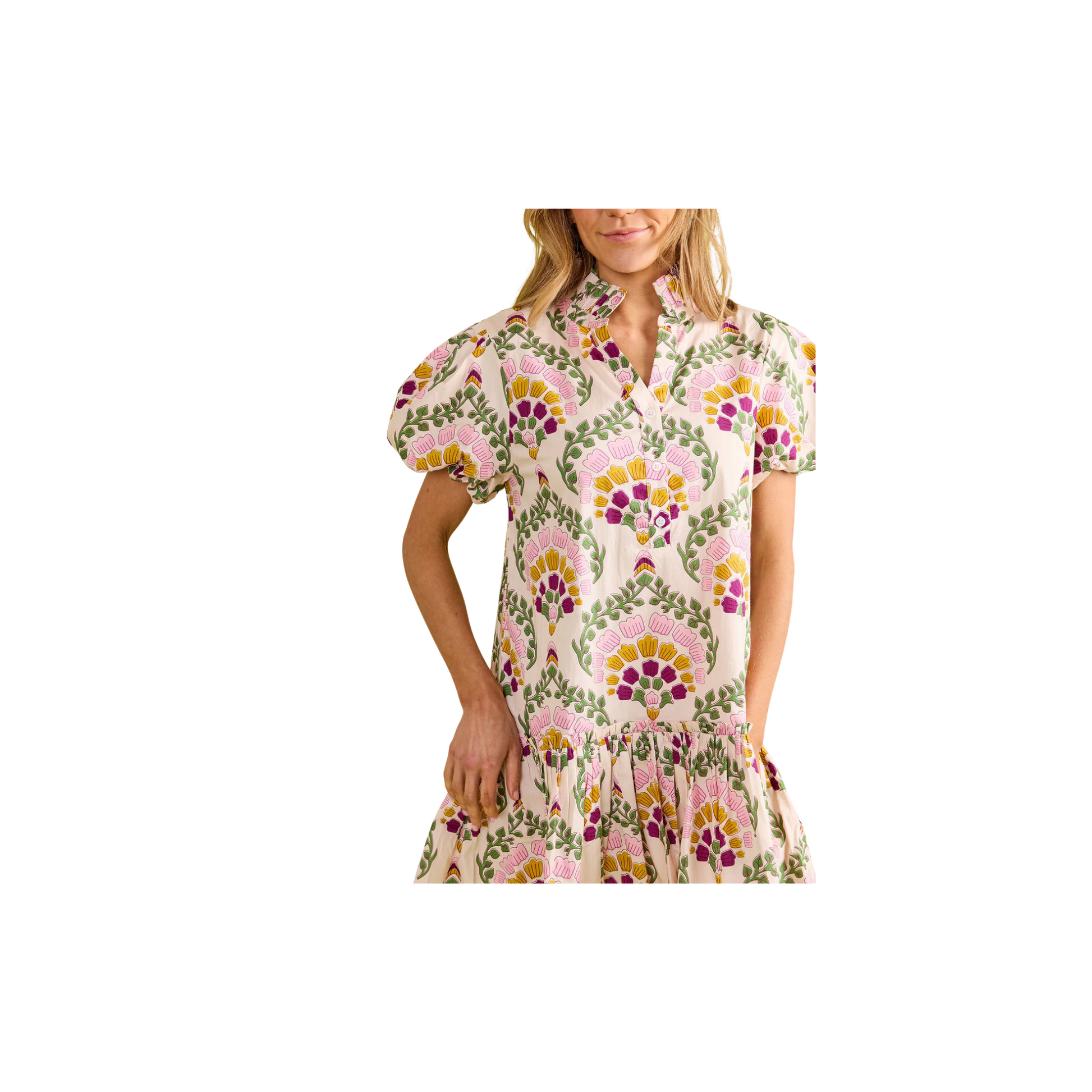 The Gia Dress is a perfect blend of timeless charm and modern style. This short puff sleeve dress features a ruffled mock neck with button-front detailing, and a drop waist ruffled skirt for an additional touch of flare.