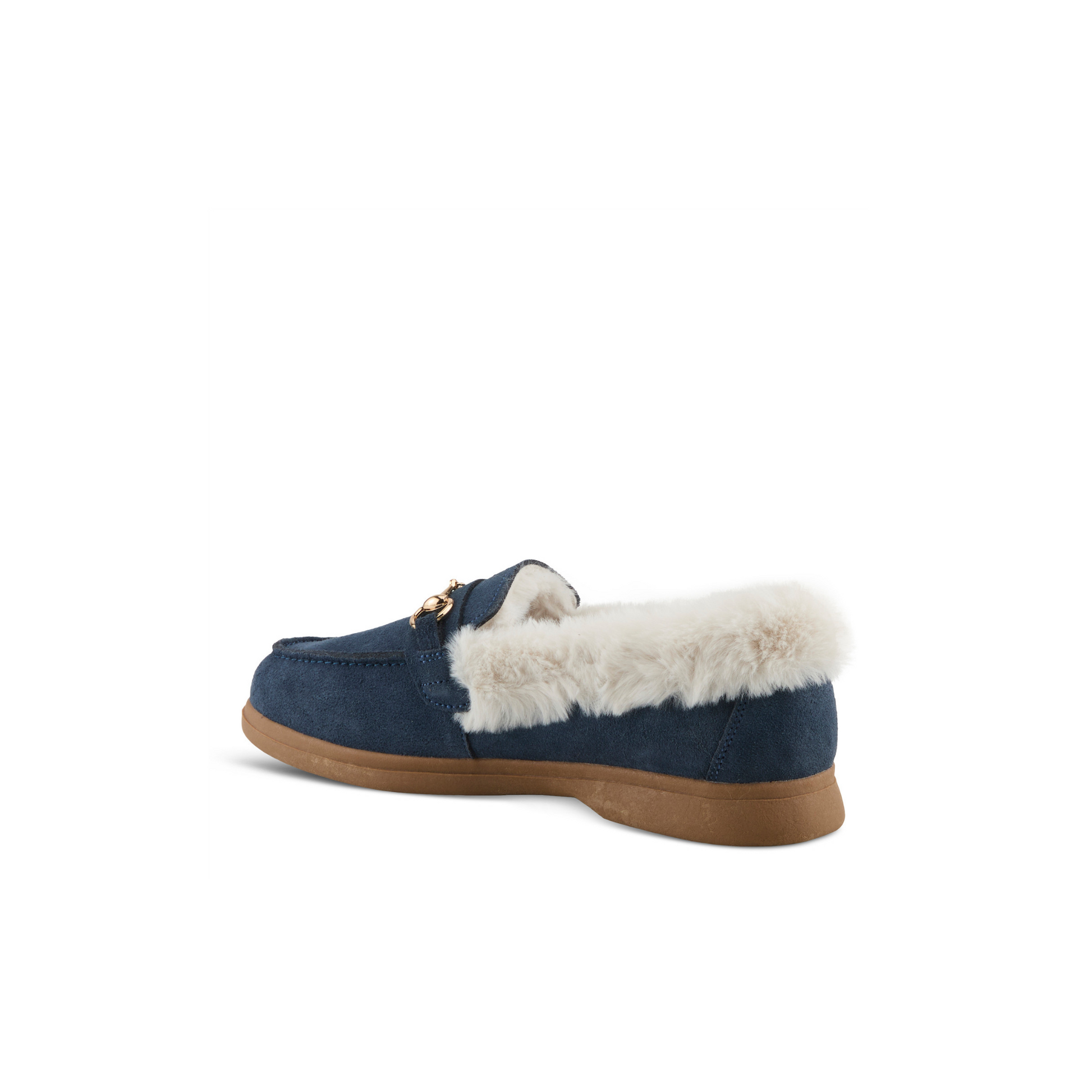 LAURIN Indulge in cozy sophistication with a stylish suede loafer designed for effortless elegance and comfort. The contrast faux fur trim adds a luxurious touch while providing extra warmth and softness. A polished metal bit with hardware detailing elevates the classic loafer silhouette, making it perfect for both casual and refined looks. The slip-on design ensures easy wear, while the lightweight, flexible outsole offers all-day comfort and durability. Whether lounging at home or stepping out in style, this versatile loafer seamlessly blends fashion and function for a chic, cozy footwear essential.