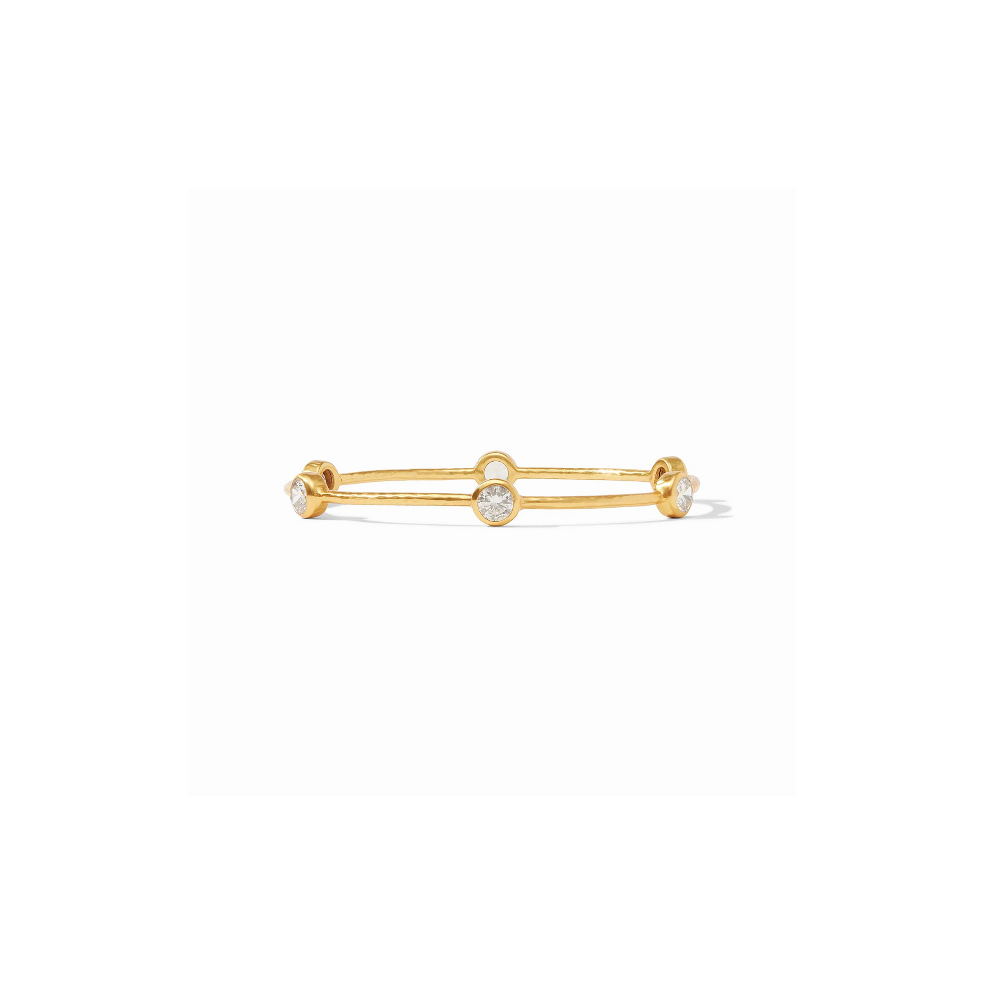 A lightly hammered bangle features six circular gemstones that sit along the length of this slim bangle, making it perfect for mixing and matching to create a striking color story on your wrist.