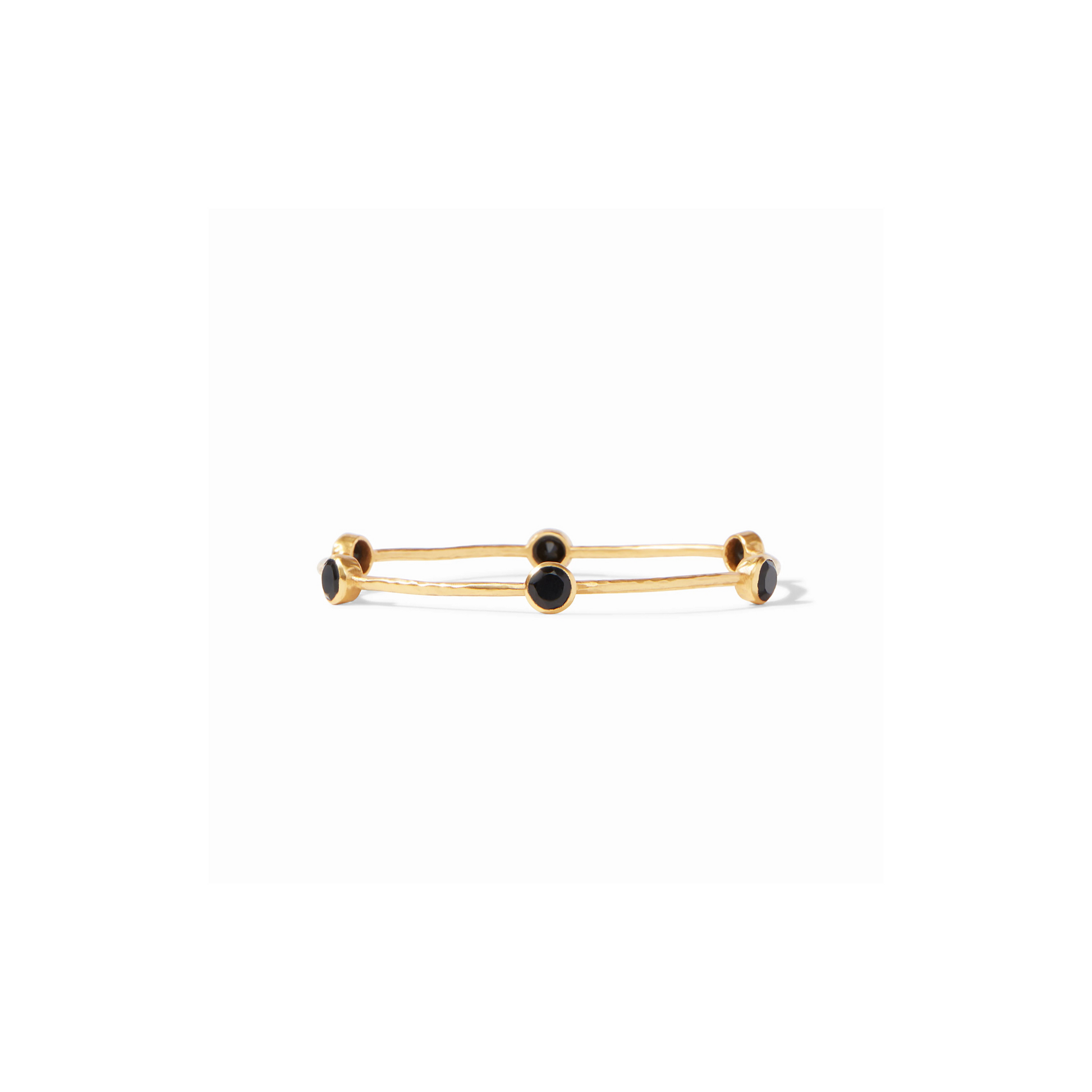 A lightly hammered bangle features six circular gemstones that sit along the length of this slim bangle, making it perfect for mixing and matching to create a striking color story on your wrist.