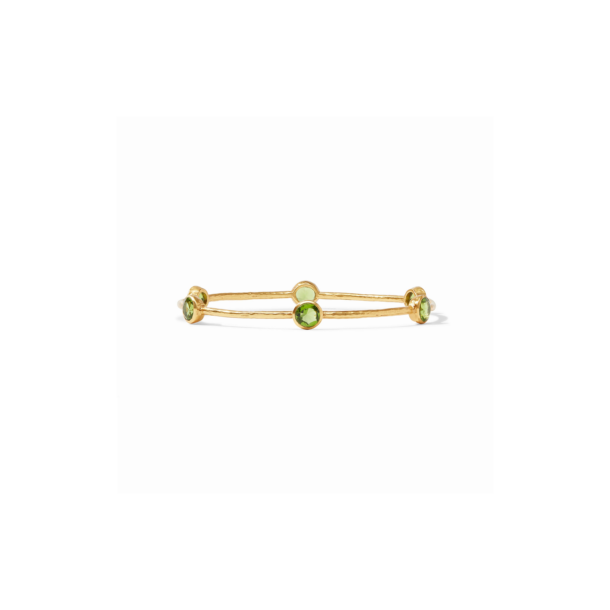 A lightly hammered bangle features six circular gemstones that sit along the length of this slim bangle, making it perfect for mixing and matching to create a striking color story on your wrist.