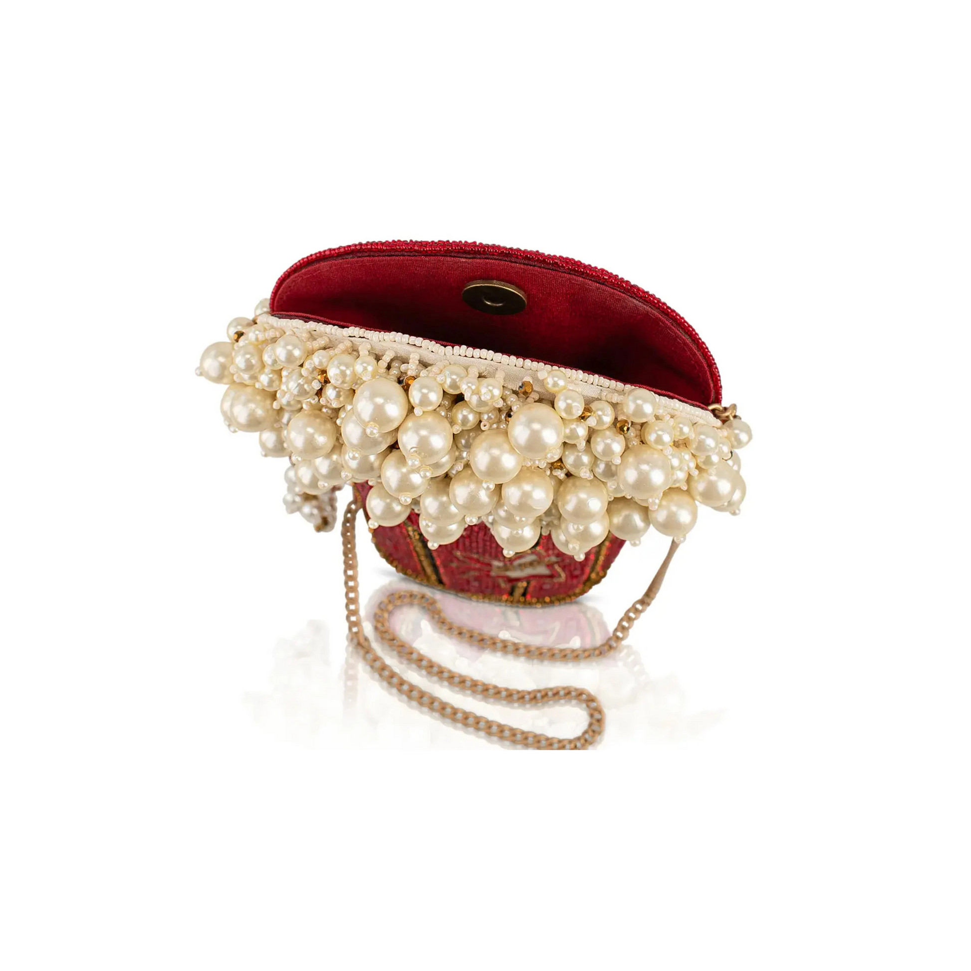 Pop, sparkle, glam! Movie Night is serving red carpet realness with a buttery twist. Overflowing with beige pearly “popcorn” and retro charm, this purse is your ultimate scene-stealer whether you're at the cinema or just dressing like the pop star you are. Features a removable beaded gold chain crossbody strap, secure magnetic closure, and an inside slit pocket, perfectly sized to fit your phone.