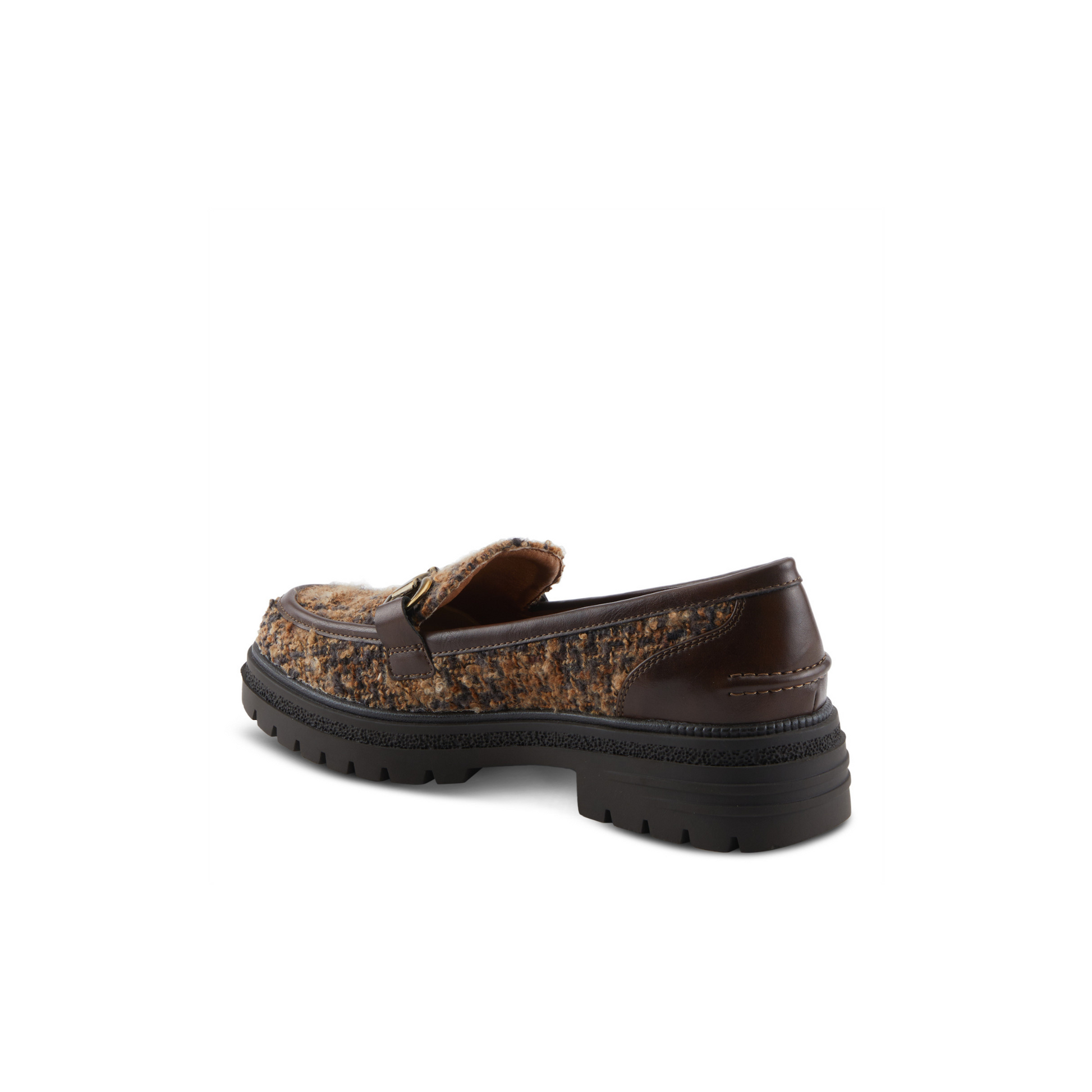 NACARRI Step into bold style with this ultra-chic, fashion-forward loafer that blends classic sophistication with modern edge. Featuring a textured boucle upper with sleek faux leather trim, this loafer is the perfect mix of cozy and cool. The gold-toned horse bit detail adds a luxe touch, while the chunky lug sole delivers a sporty, on-trend vibe with all-day comfort. Whether paired with tailored pieces or casual essentials, this loafer is a statement-making must-have for effortless style.