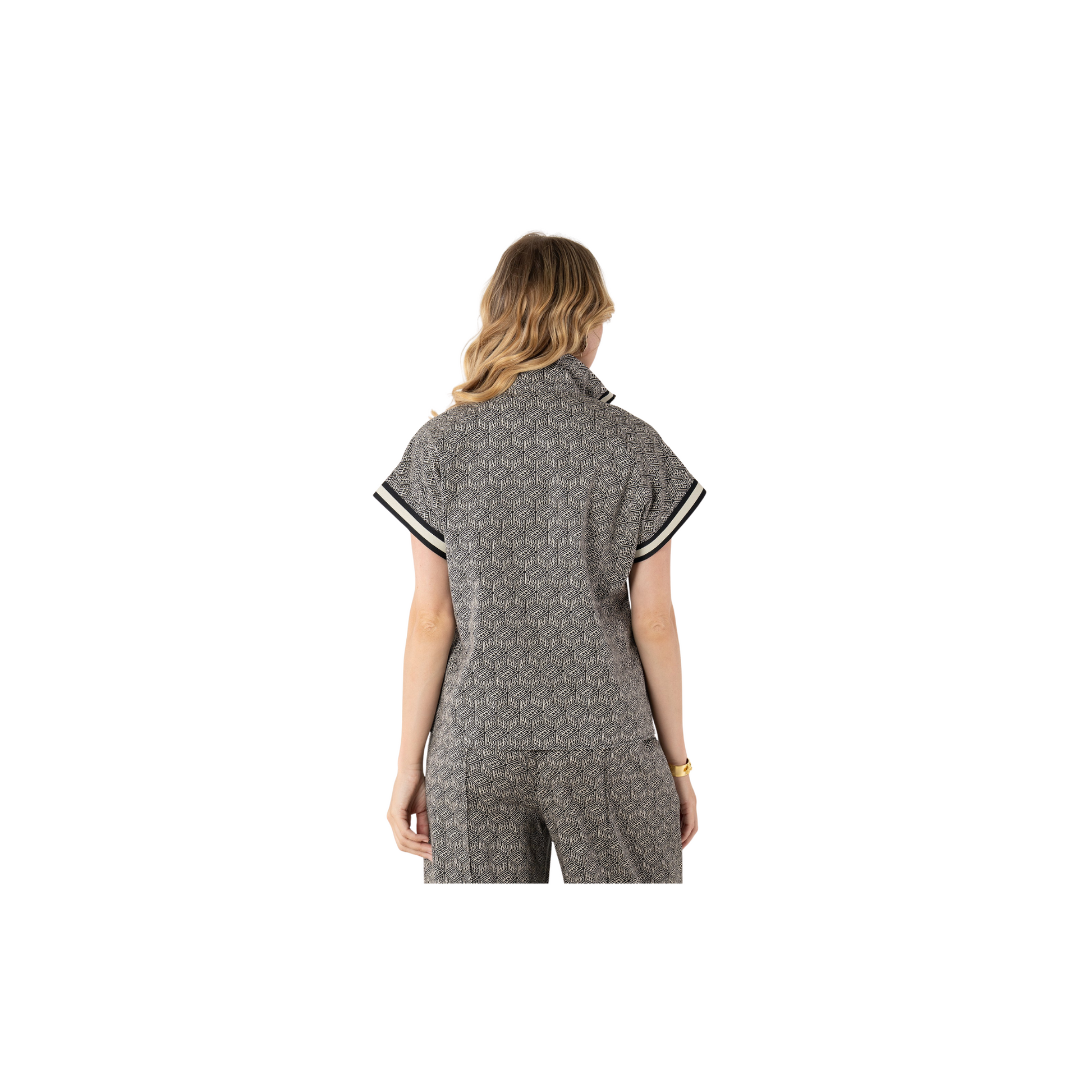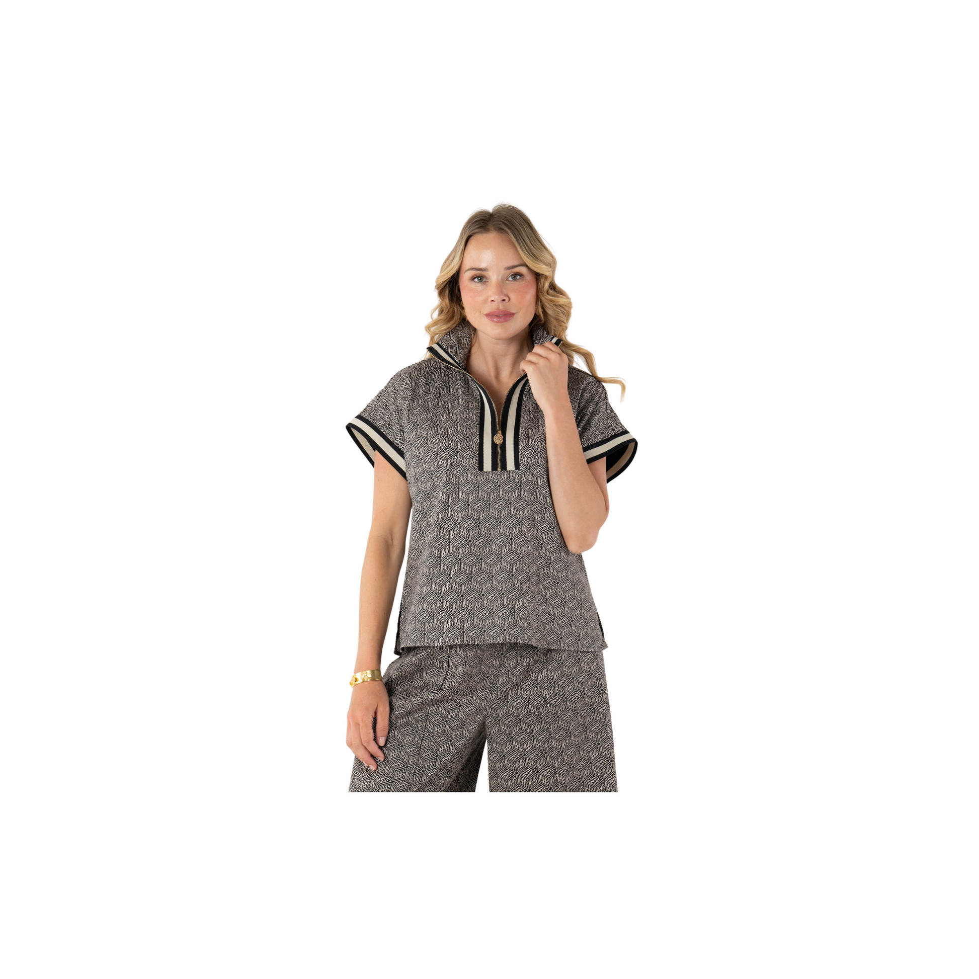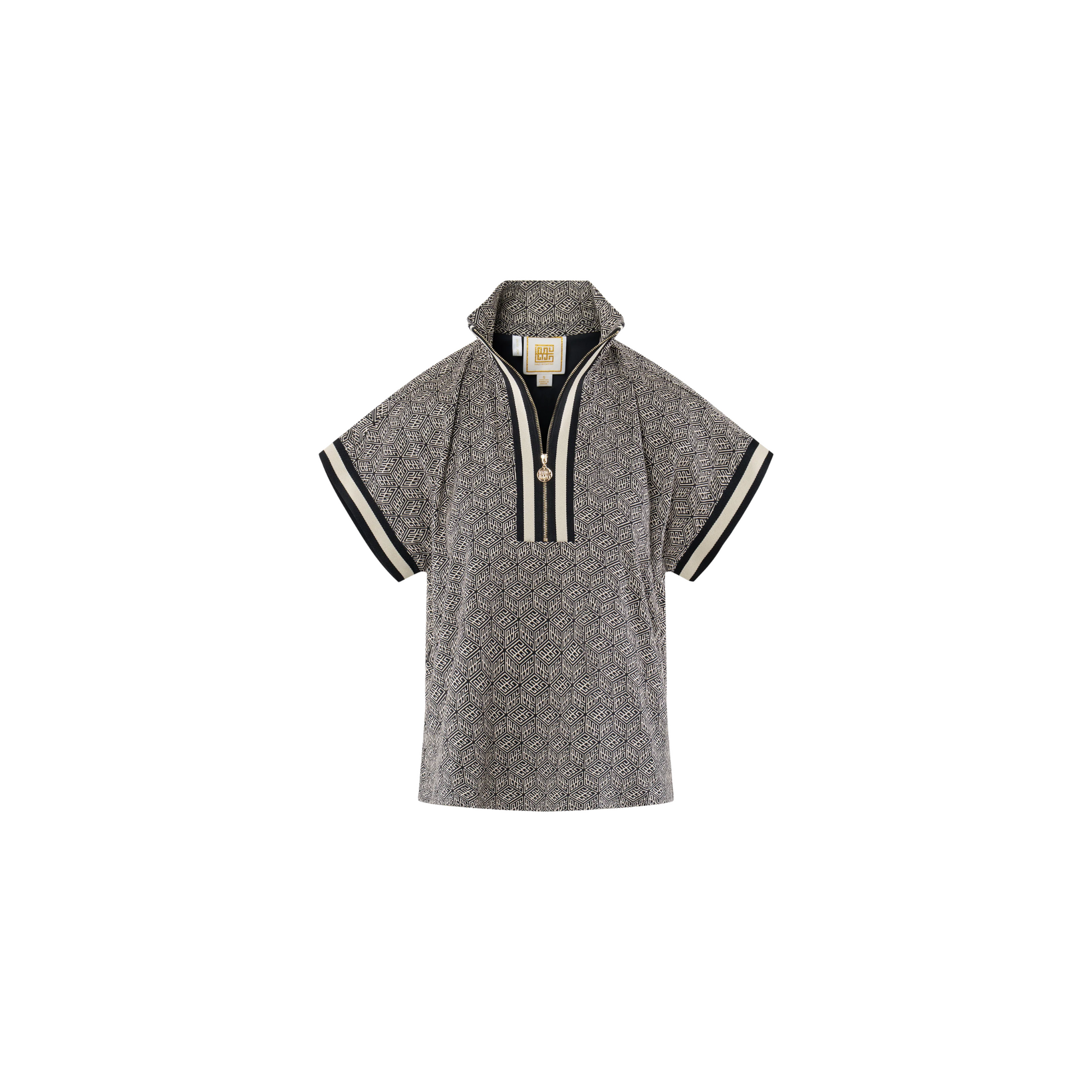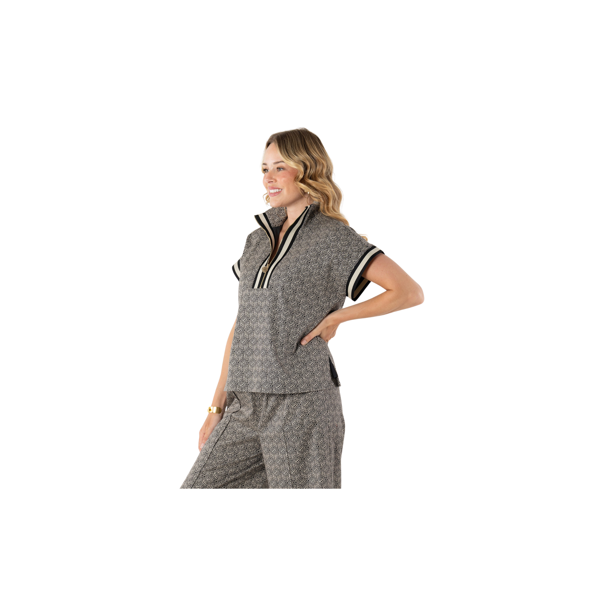 A sporty statement with chic detail, the Poppy Pullover in Black Tonal Monogram features a relaxed dolman sleeve and a 3/4 zip neckline finished with our signature gold zipper pull. Black and white striped trim adds bold contrast, while the tonal monogram print offers a subtle nod to the brand with a repeating logo motif throughout. Whether styled for casual outings, game day gatherings, or layered into your fall rotation, this pullover blends comfort and sophistication with ease.