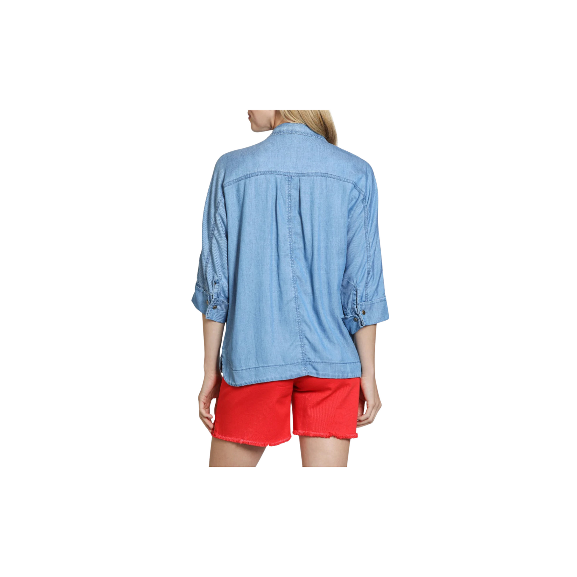 This top is a relaxed-fit, light blue chambray blouse with a soft, textured fabric. It features a split V-neckline with a partial button placket and a collared design. The sleeves are three-quarter length with a subtle cuff detail, adding a laid-back yet polished touch. Perfect for casual wear, it pairs effortlessly with shorts or jeans.