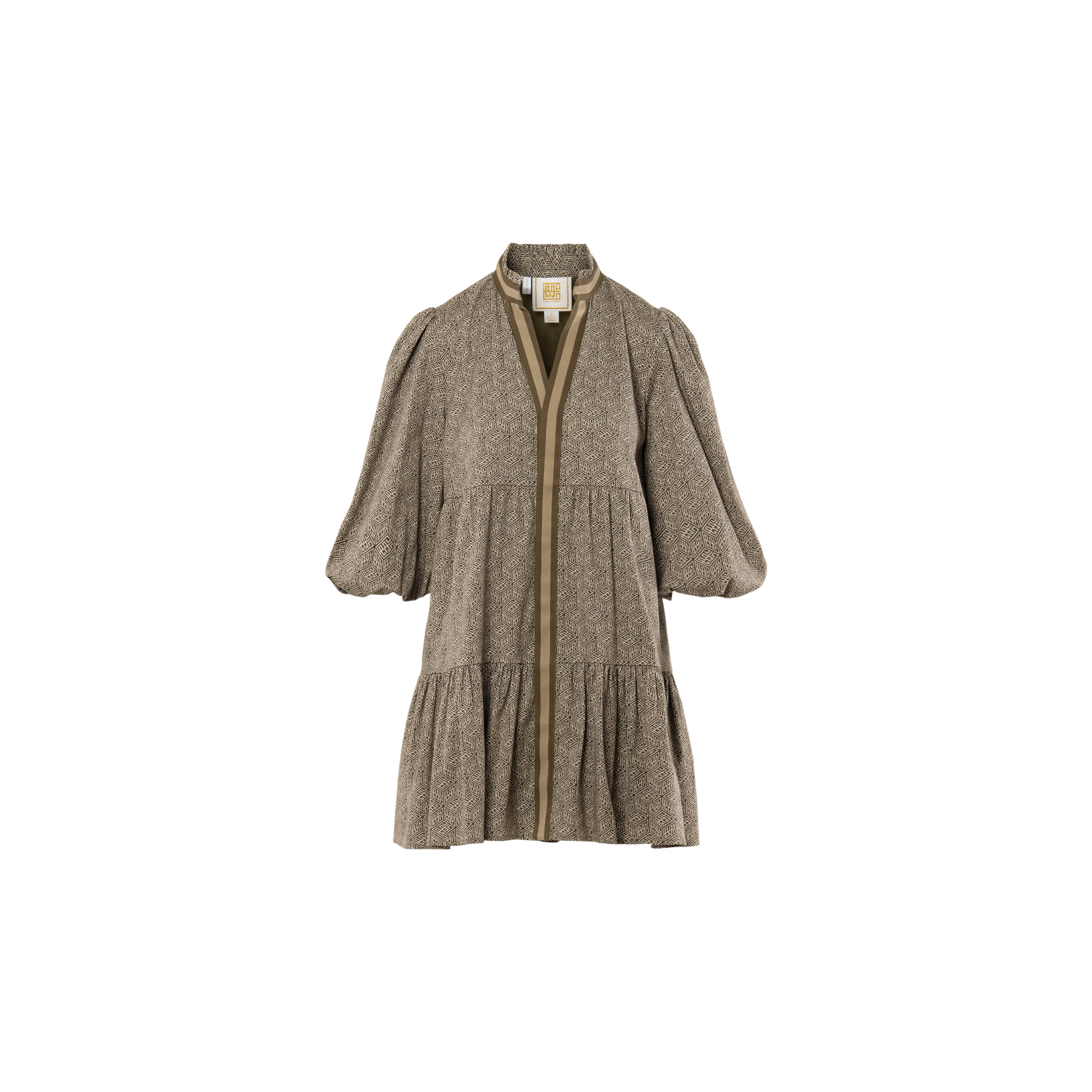 A fresh take on feminine ease, the Sadie Dress in Green Tonal Monogram features a relaxed tiered silhouette with quarter-length blouson sleeves and a concealed button-front placket trimmed in green and tan. The signature monogram print adds visual depth in a soft, tone-on-tone finish. Designed with versatility in mind, this transitional dress moves effortlessly from casual days with sneakers to cooler months paired with knee-high boots. An easy favorite for fall and beyond.