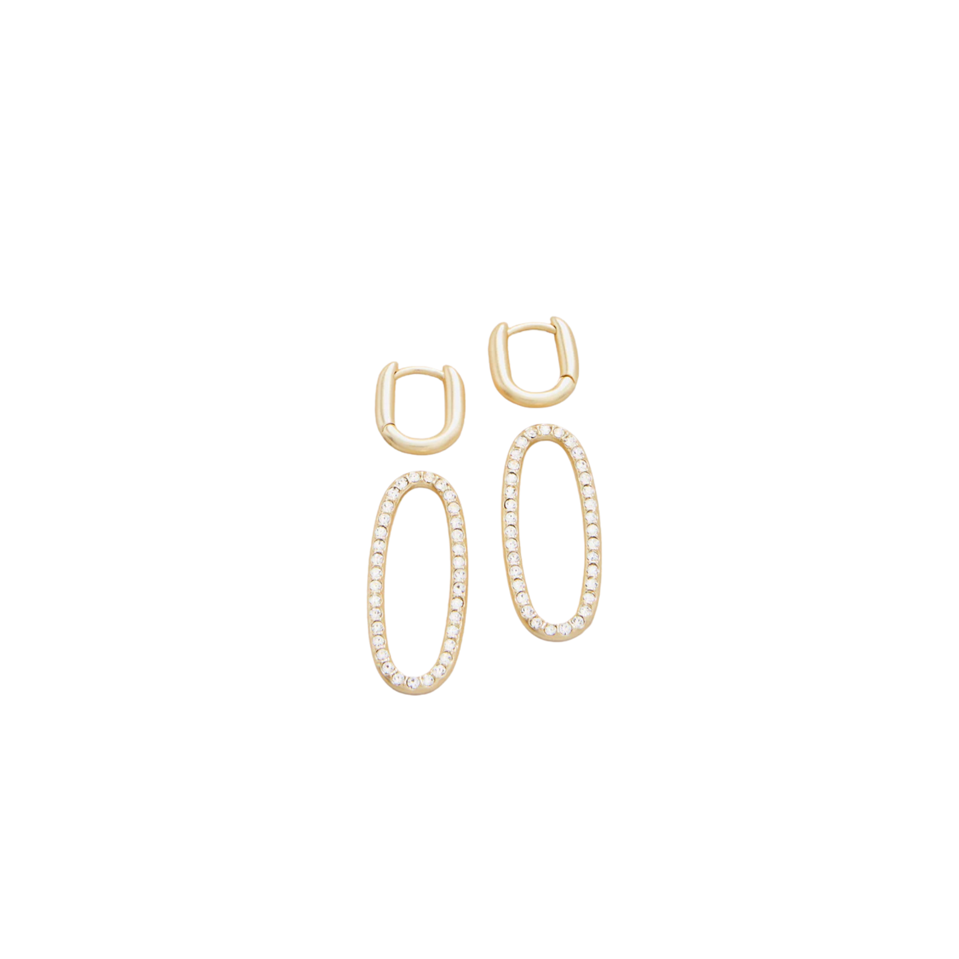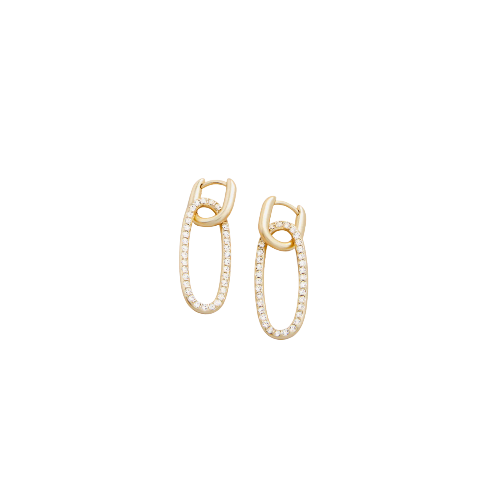 Made to dazzle and dangle, our lightweight Hudson Convertible Hoop Earrings are studded in glass crystals that loop around hinged hoops, both plated in 18kt matte gold. Bonus, remove the drop for a simple gold hoop. 2-looks-in-1!